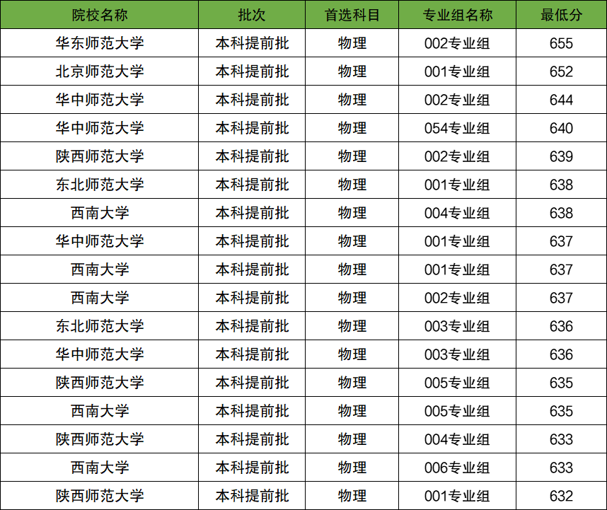 其中最低分院校为陕西师范大学(001专业组),2025年最低分为632分。最高分院校为华东师范大学(002专业组),2025年最高分为655分。
