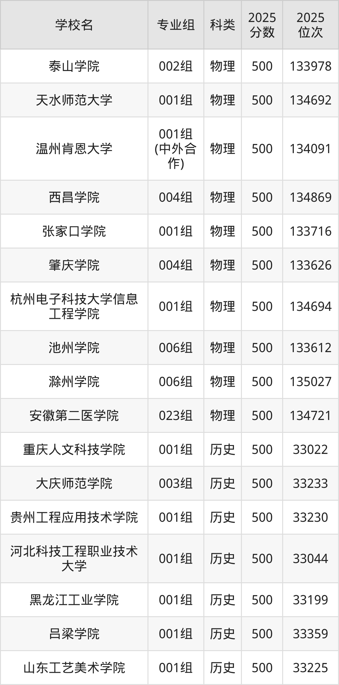 2025年在安徽高考历史类录取分数线是498分的大学有朝阳师范学院、呼伦贝尔学院、吉林体育学院、景德镇艺术职业大学、南阳理工学院、南阳师范学院、内蒙古科技大学包头师范学院、山东工艺美术学院、沈阳音乐学院、新疆艺术学院等。物理类录取分数线是498分的大学有德州学院、贵州理工学院、贵州师范大学、黄淮学院、吉林化工大学、吉林建筑大学、济宁学院、佳木斯大学、金华职业技术大学、兰州工业学院等。