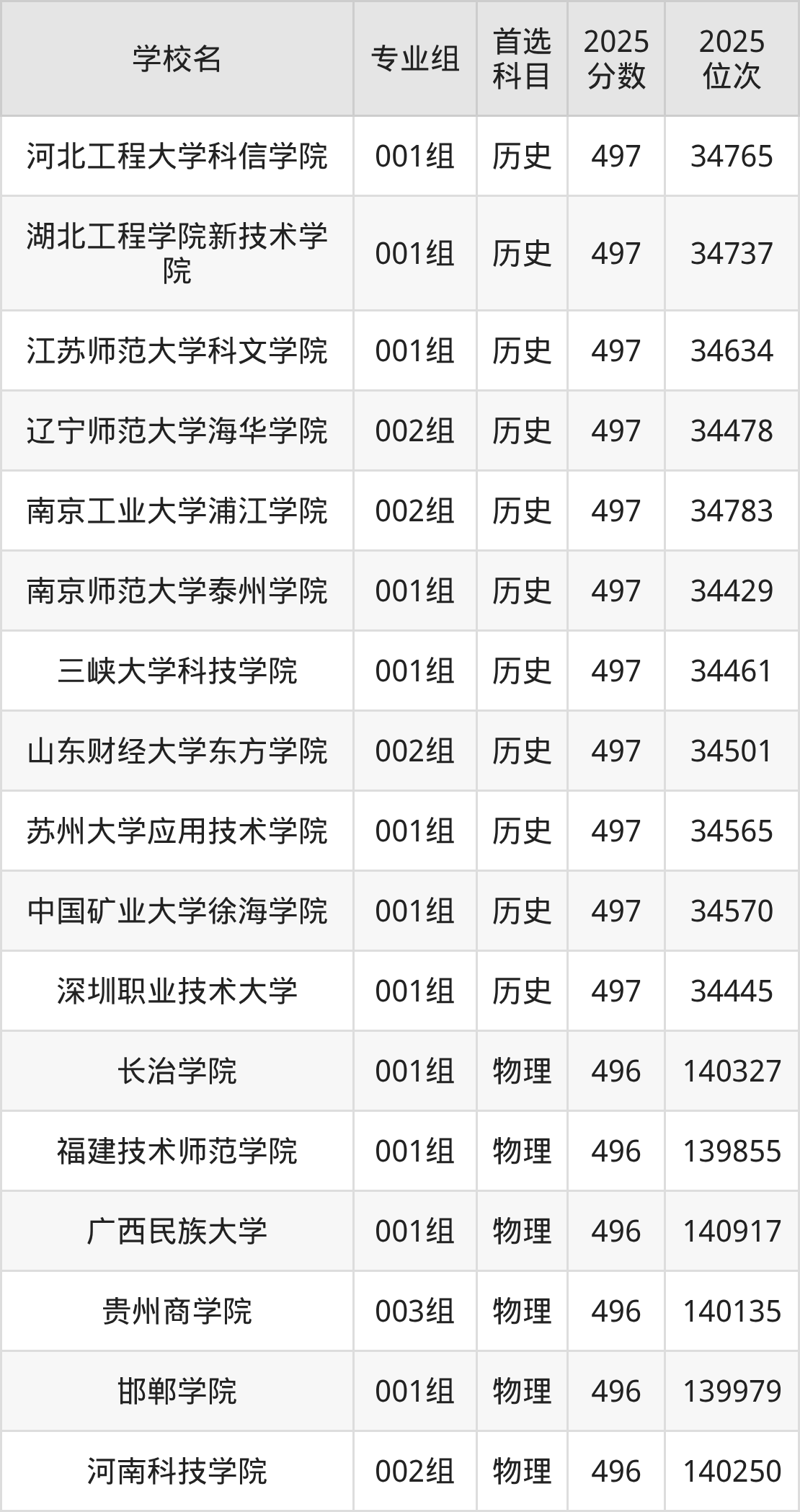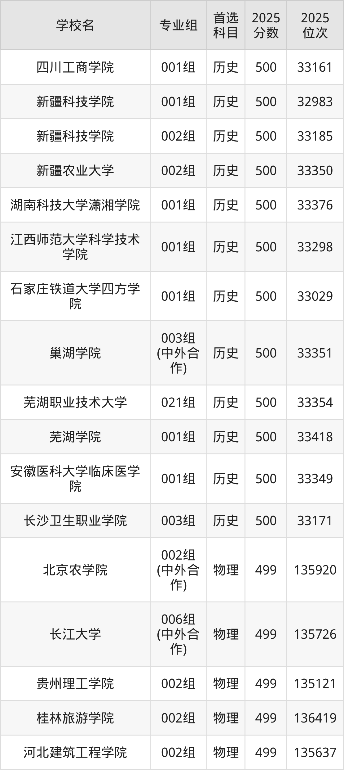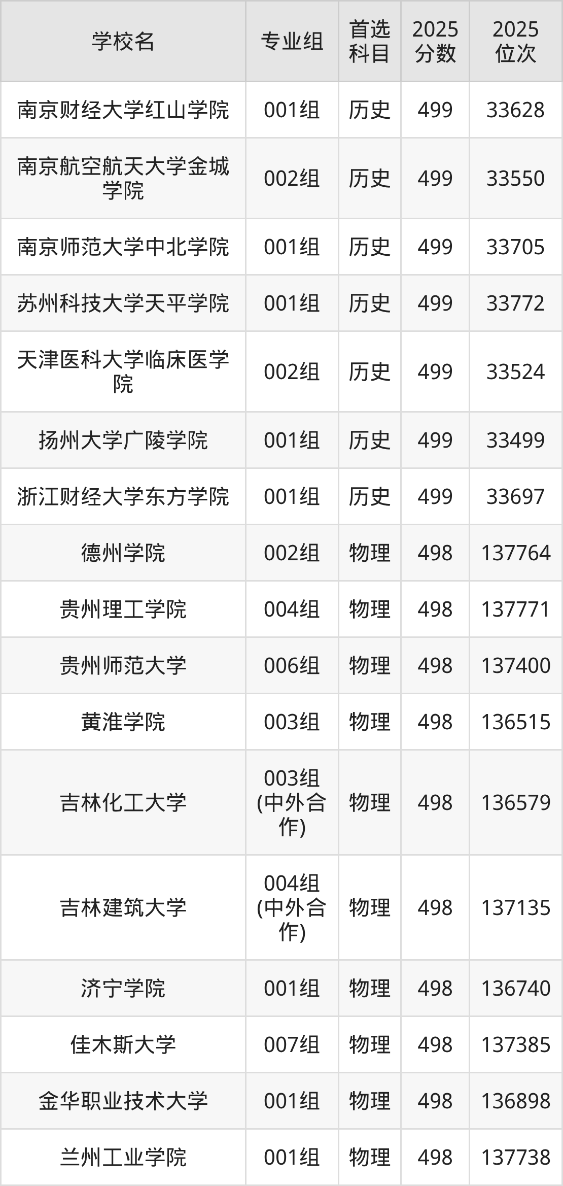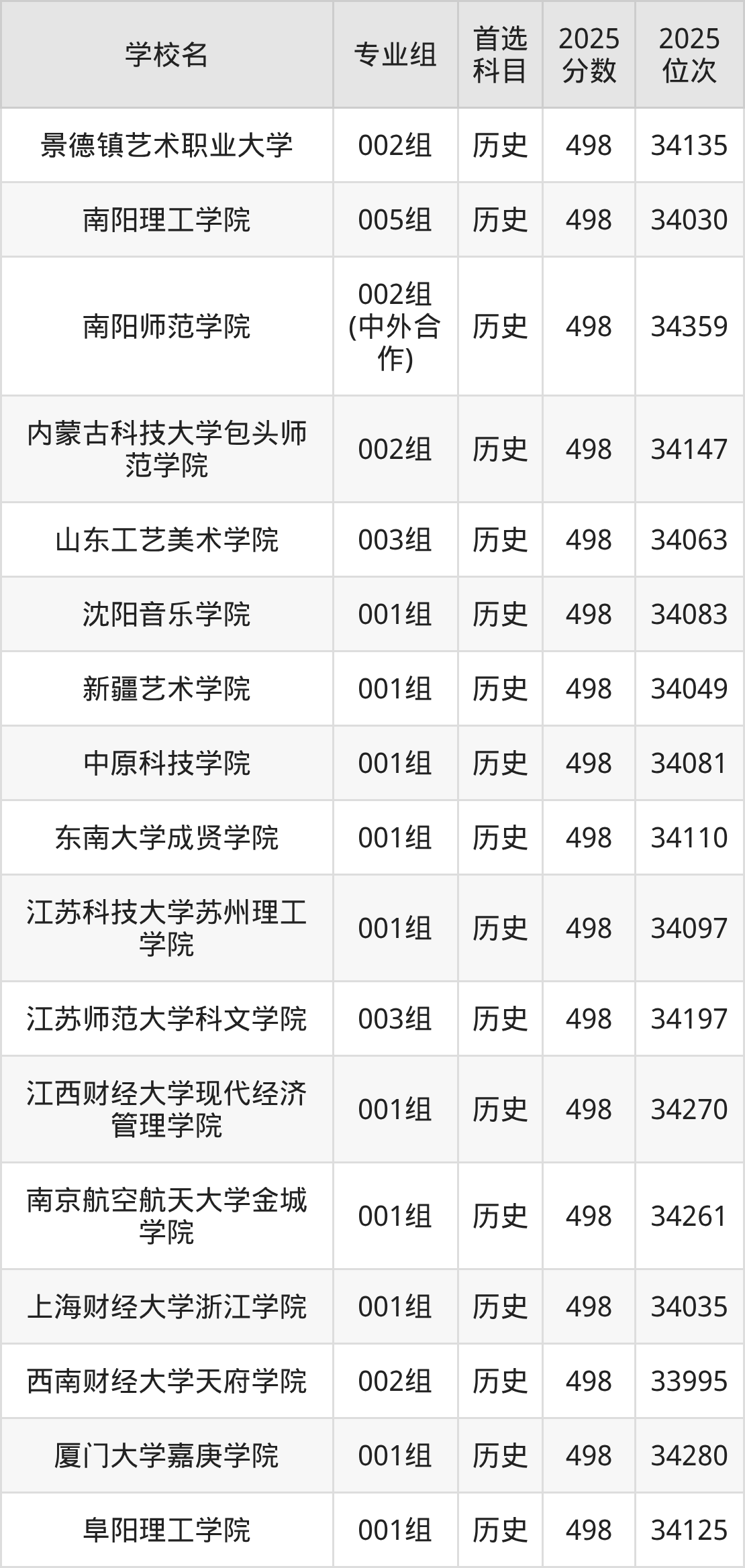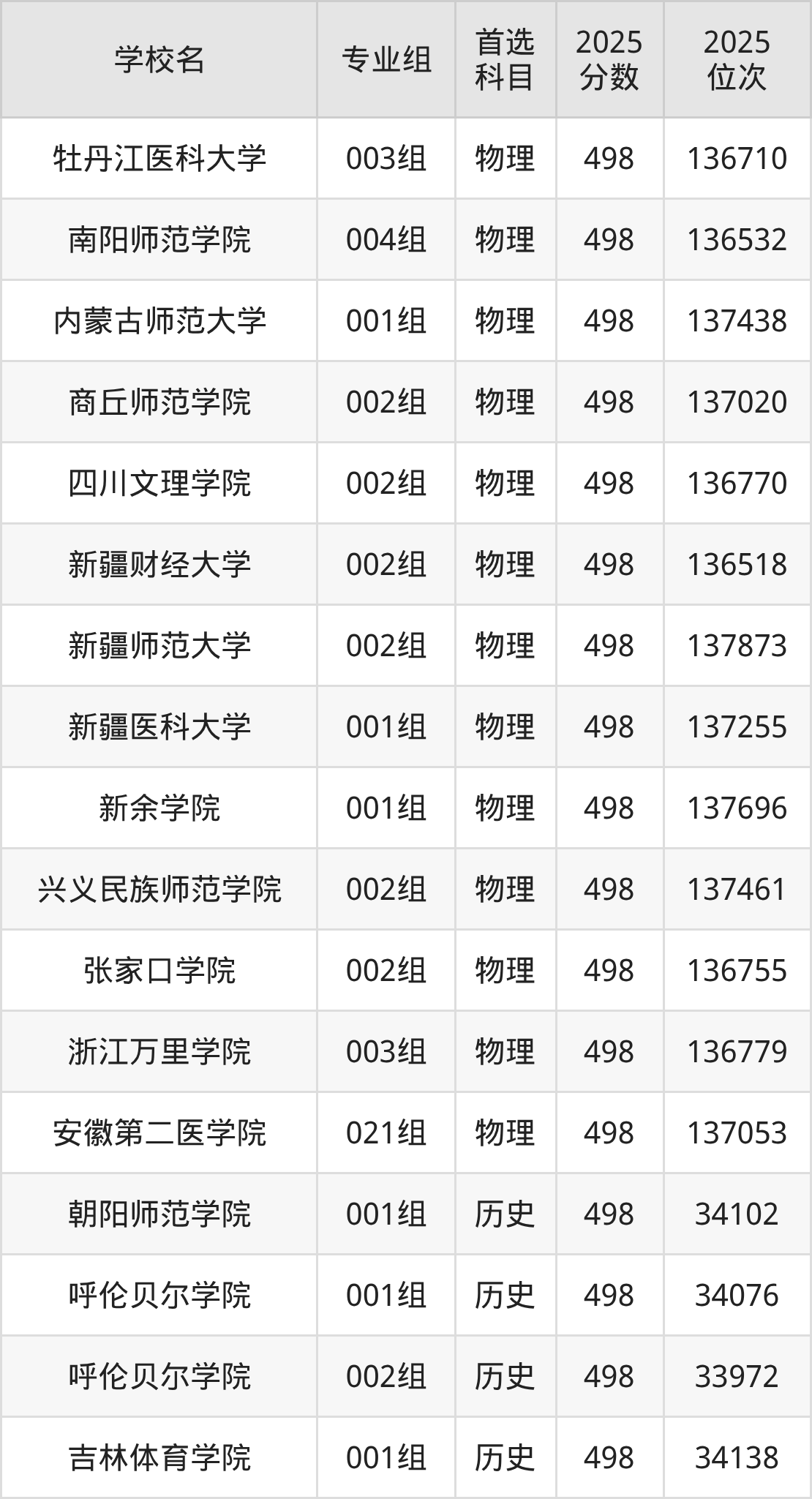 安徽高考历史类498分对应的位次排名是33972名-34359名,物理类498分对应的位次排名是136515名-137873名,因此建议2026年位次排在这附近的同学考虑这些大学。