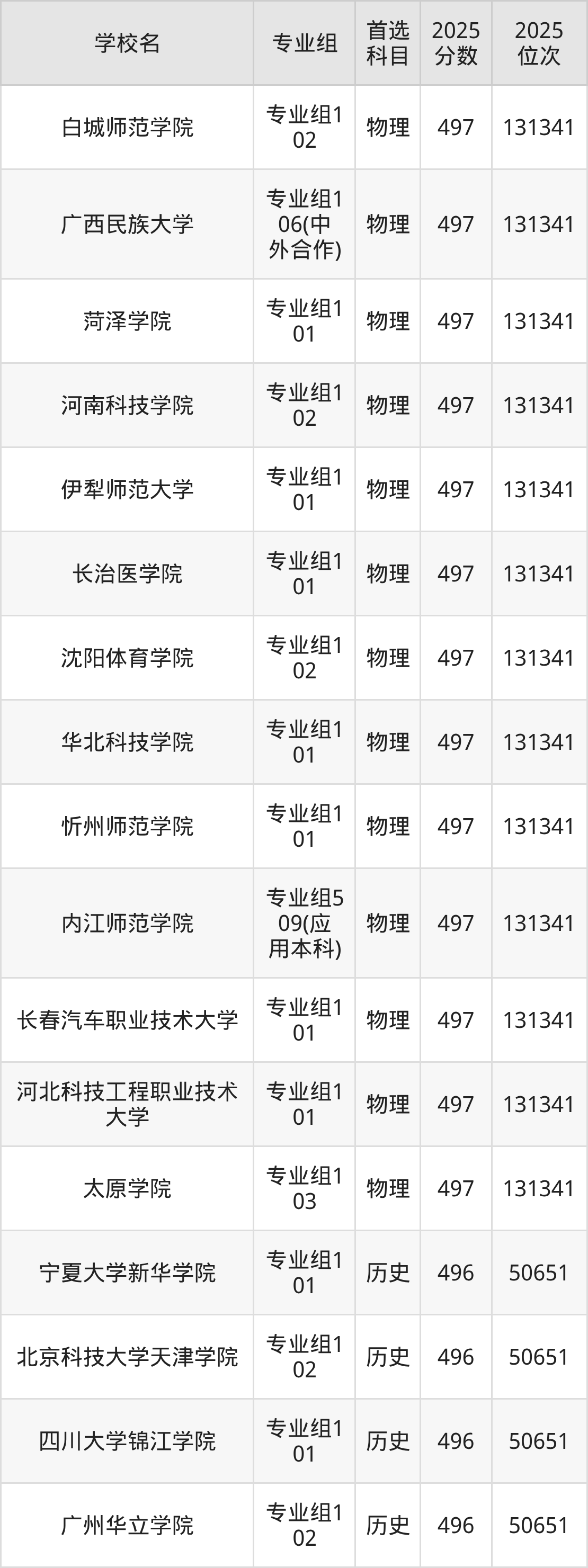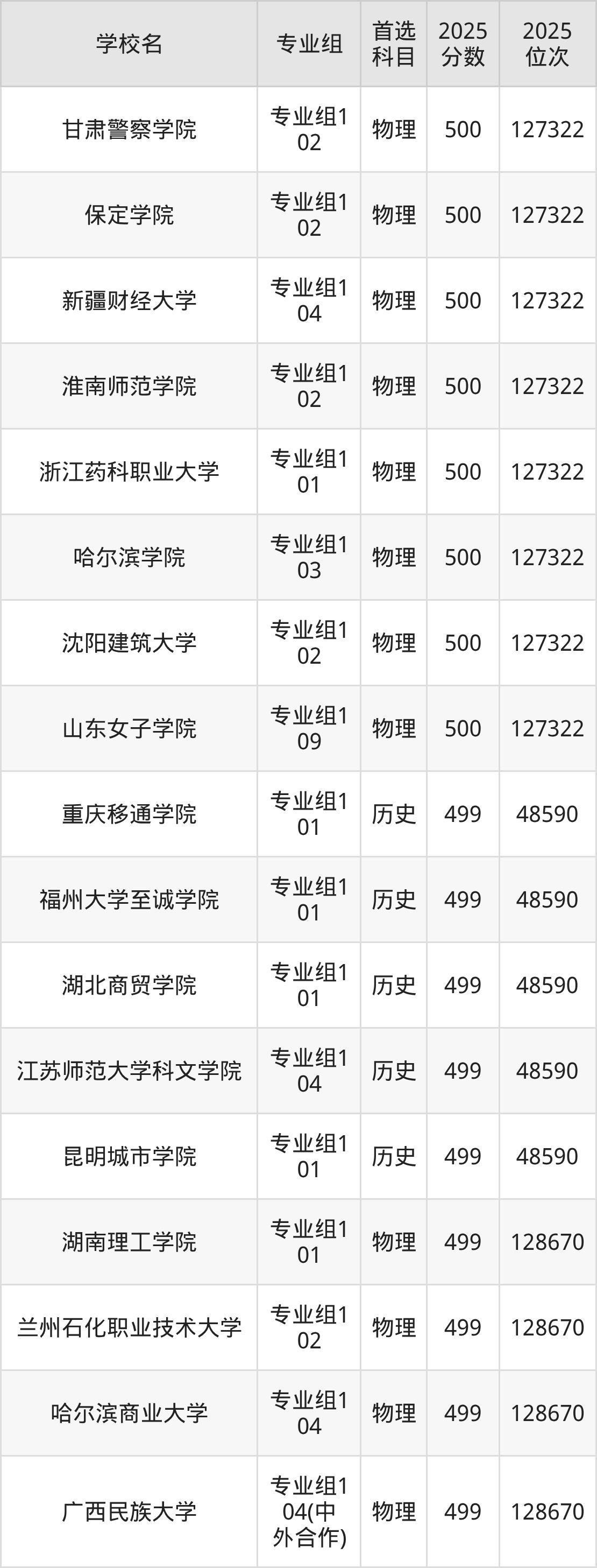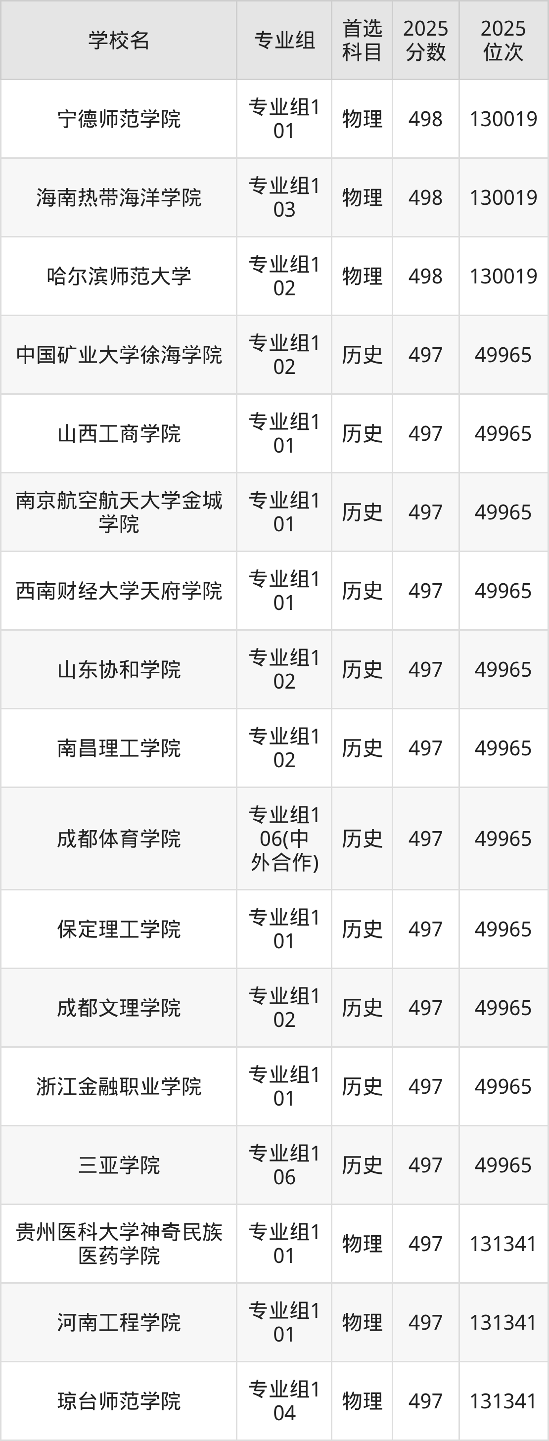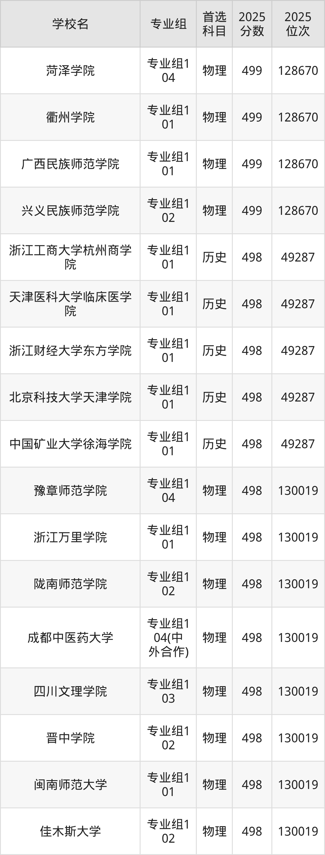 2025年在四川高考历史类录取分数线是498分的大学有浙江工商大学杭州商学院、天津医科大学临床医学院、浙江财经大学东方学院、北京科技大学天津学院、中国矿业大学徐海学院。物理类录取分数线是498分的大学有豫章师范学院、浙江万里学院、陇南师范学院、成都中医药大学、四川文理学院、晋中学院、闽南师范大学、佳木斯大学、安阳师范学院、宁夏师范大学等。