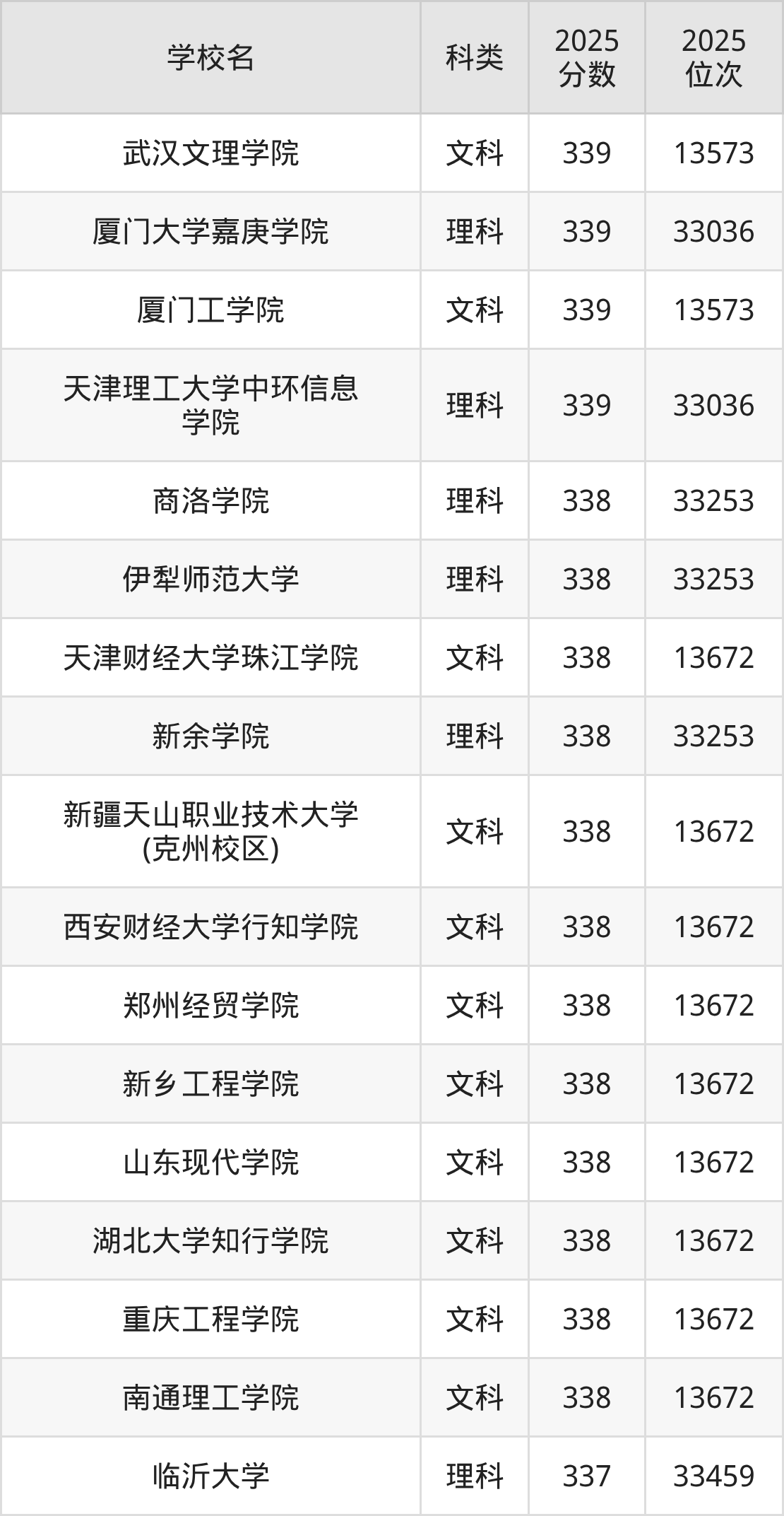 2025年在新疆高考文科录取分数线是339分的大学有江西科技学院、长沙民政职业技术学院、武汉学院、湖北恩施学院、武汉文理学院、厦门工学院。理科录取分数线是339分的大学有成都锦城学院、厦门大学嘉庚学院、天津理工大学中环信息学院。