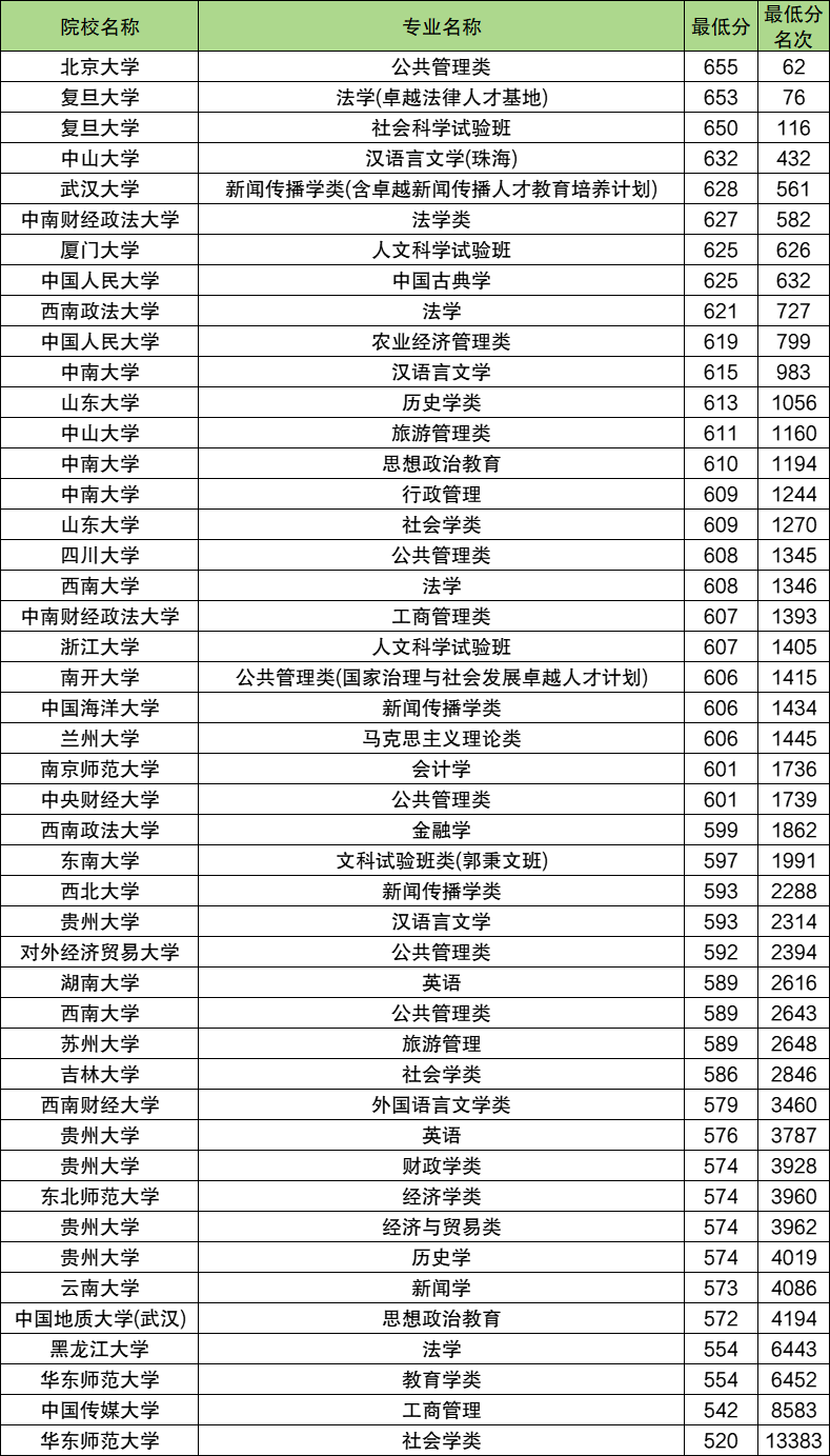 招生分数在600分以上的学校专业有25个,其中属于院校优势专业、推荐报考的有中南财经政法大学的法学类(627分)、中央财经大学的公共管理类(601分)等。