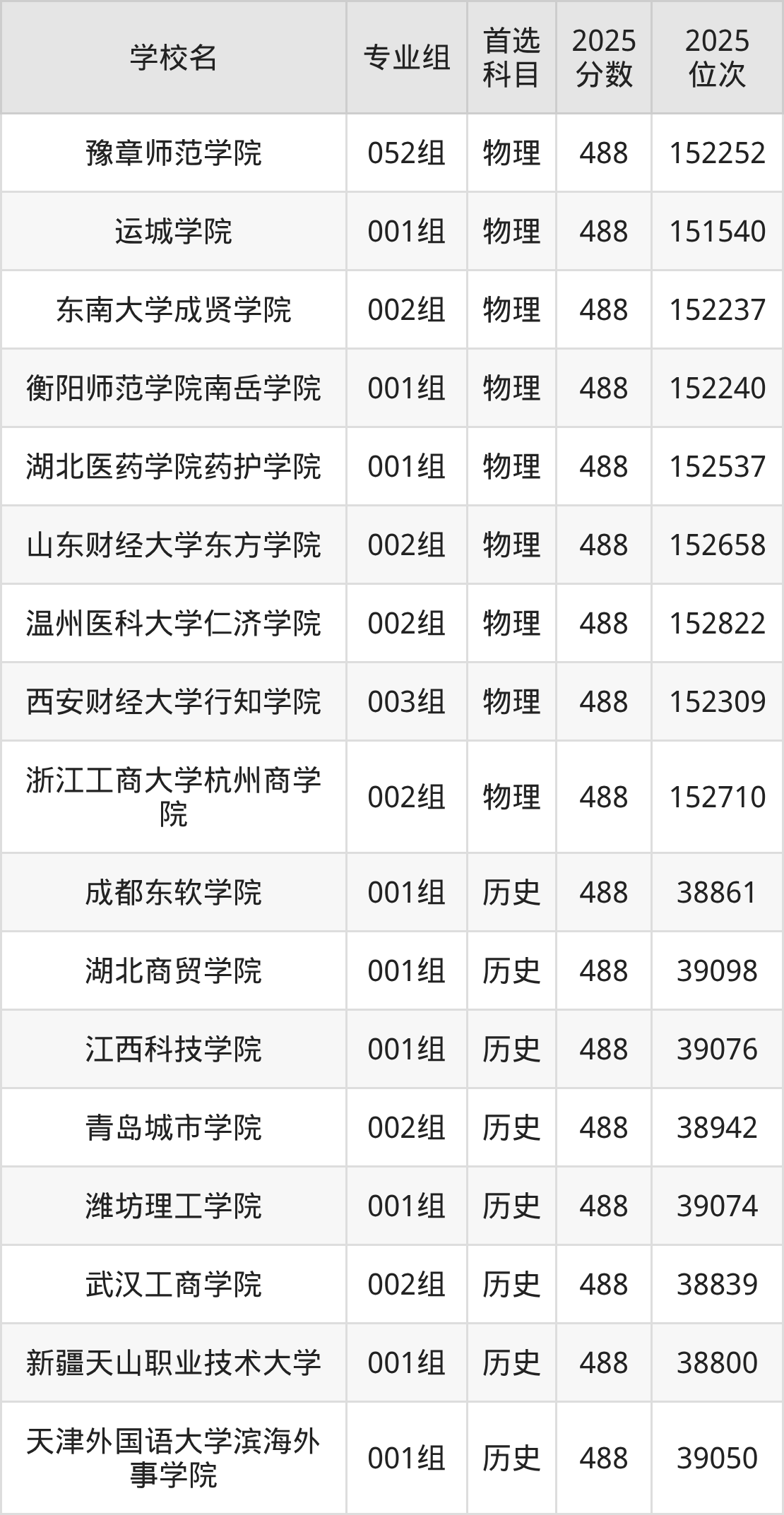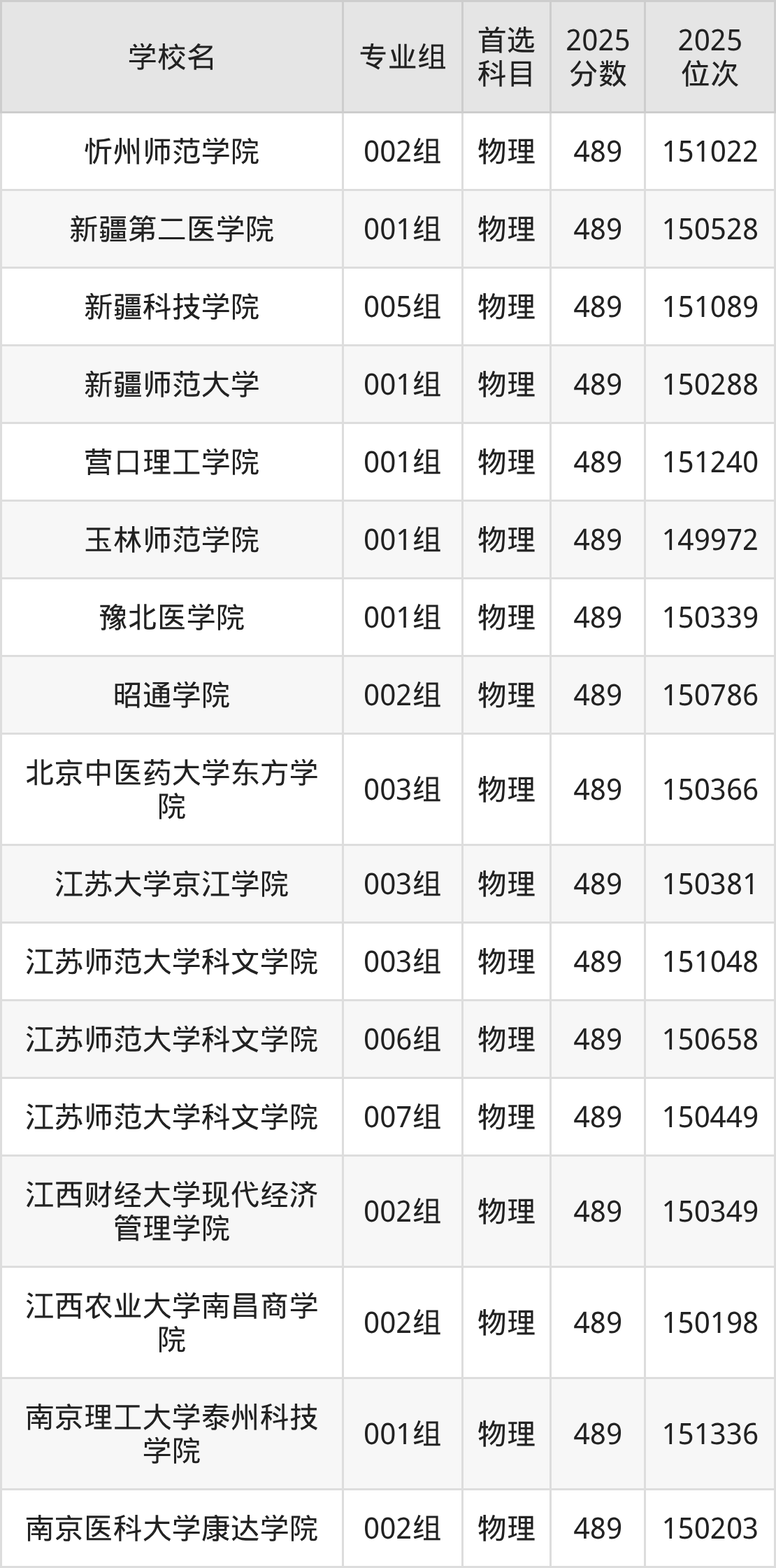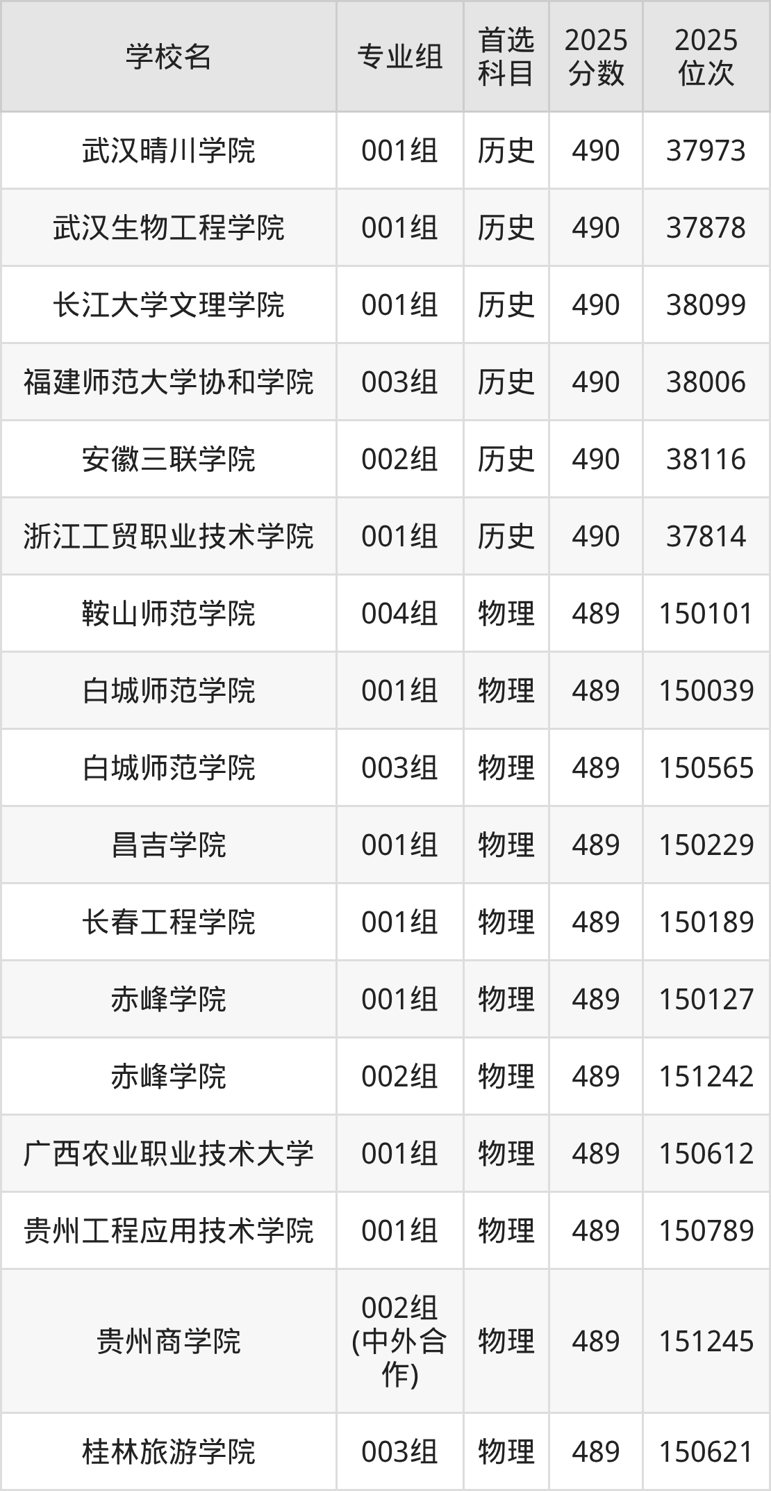 安徽高考历史类489分对应的位次排名是38288名-38721名,物理类489分对应的位次排名是149838名-151355名,因此建议2026年位次排在这附近的同学考虑这些大学。