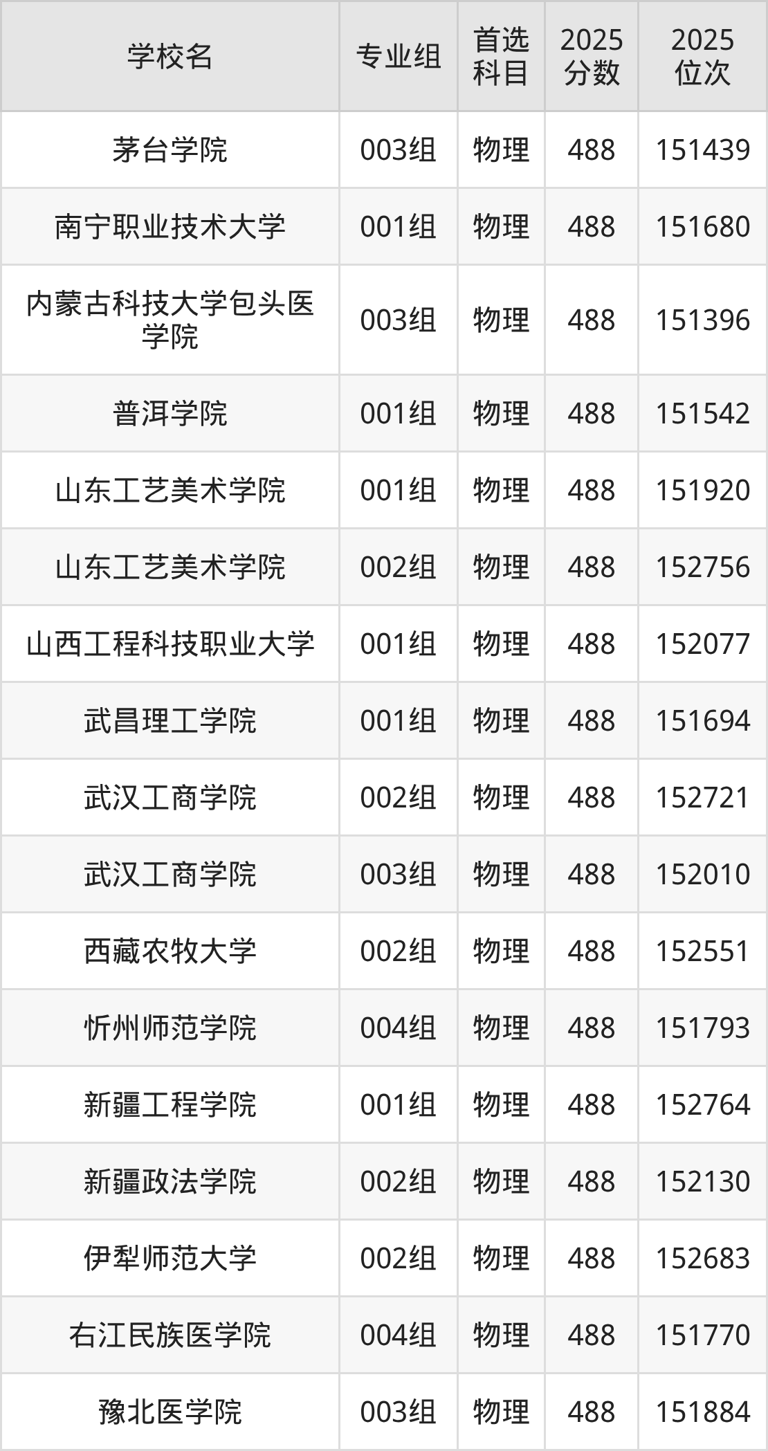 2025年在安徽高考物理类录取分数线是489分的大学有鞍山师范学院、白城师范学院、昌吉学院、长春工程学院、赤峰学院、广西农业职业技术大学、贵州工程应用技术学院、贵州商学院、桂林旅游学院、海南热带海洋学院等。历史类录取分数线是489分的大学有江西工程学院、昆明文理学院、兰州工商学院、辽宁传媒学院、南昌交通学院、南通理工学院、四川工业科技学院、天津城建大学、武昌理工学院、运城职业技术大学等。