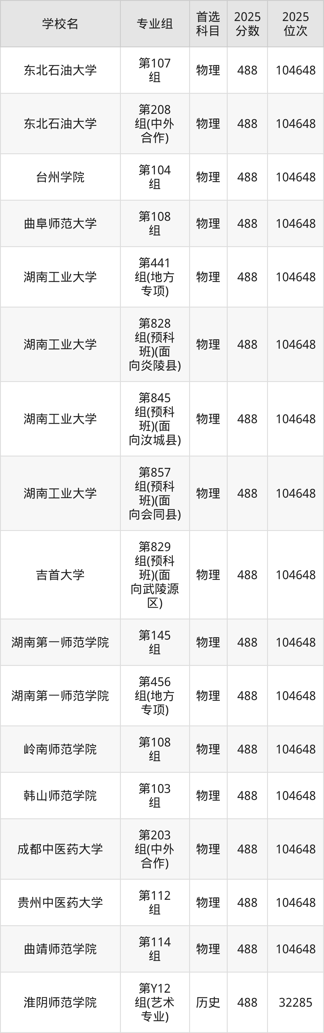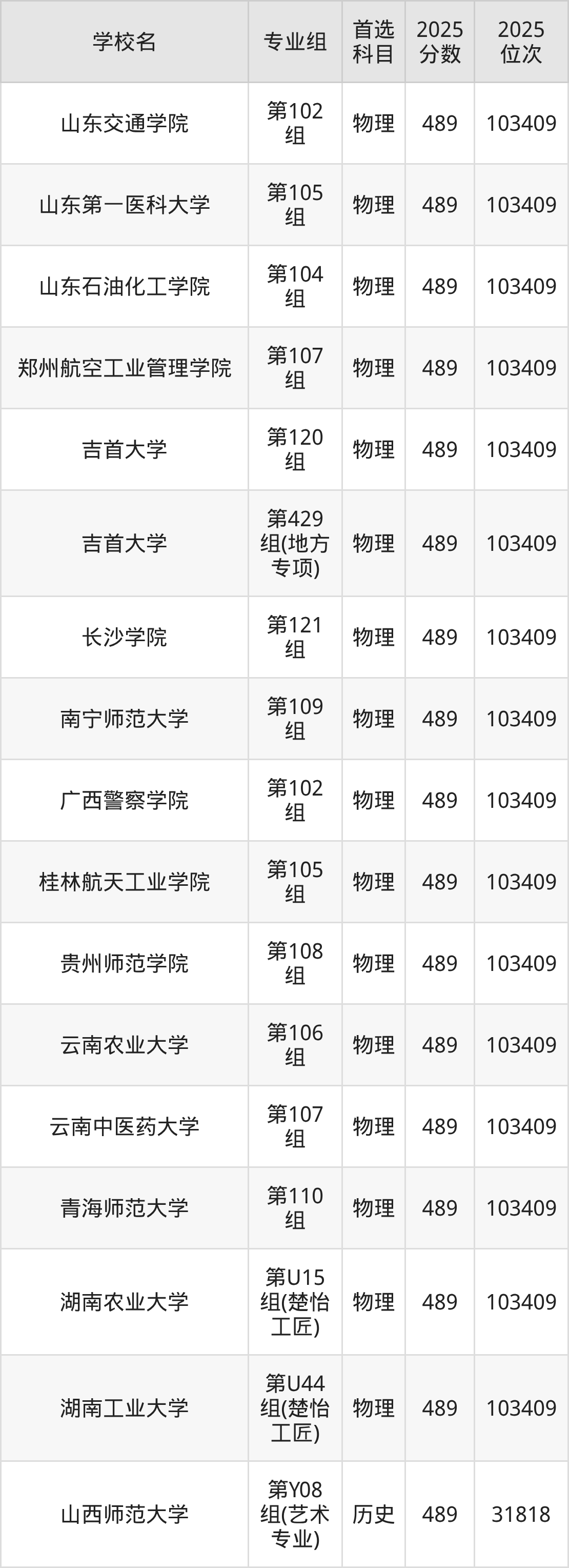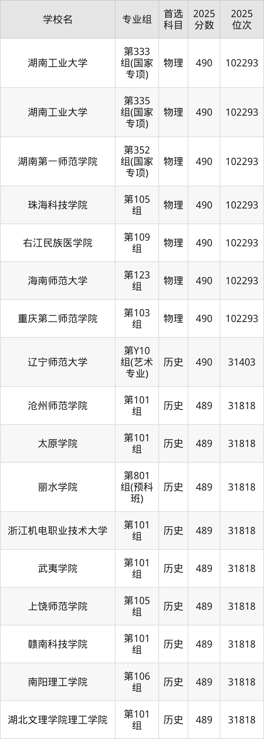 湖南高考物理类489分对应的位次排名是103409名,历史类489分对应的位次排名是31818名,因此建议2026年位次排在这附近的同学考虑这些大学。
