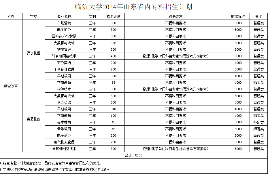 在山东省共招生5100人,在沂水校区招生3000人,专业有市场营销、电子商务、国际经济与贸易、等10个专业;在费县校区招生2100人,专业有软件技术、大数据与会计、商务英语等10个专业。