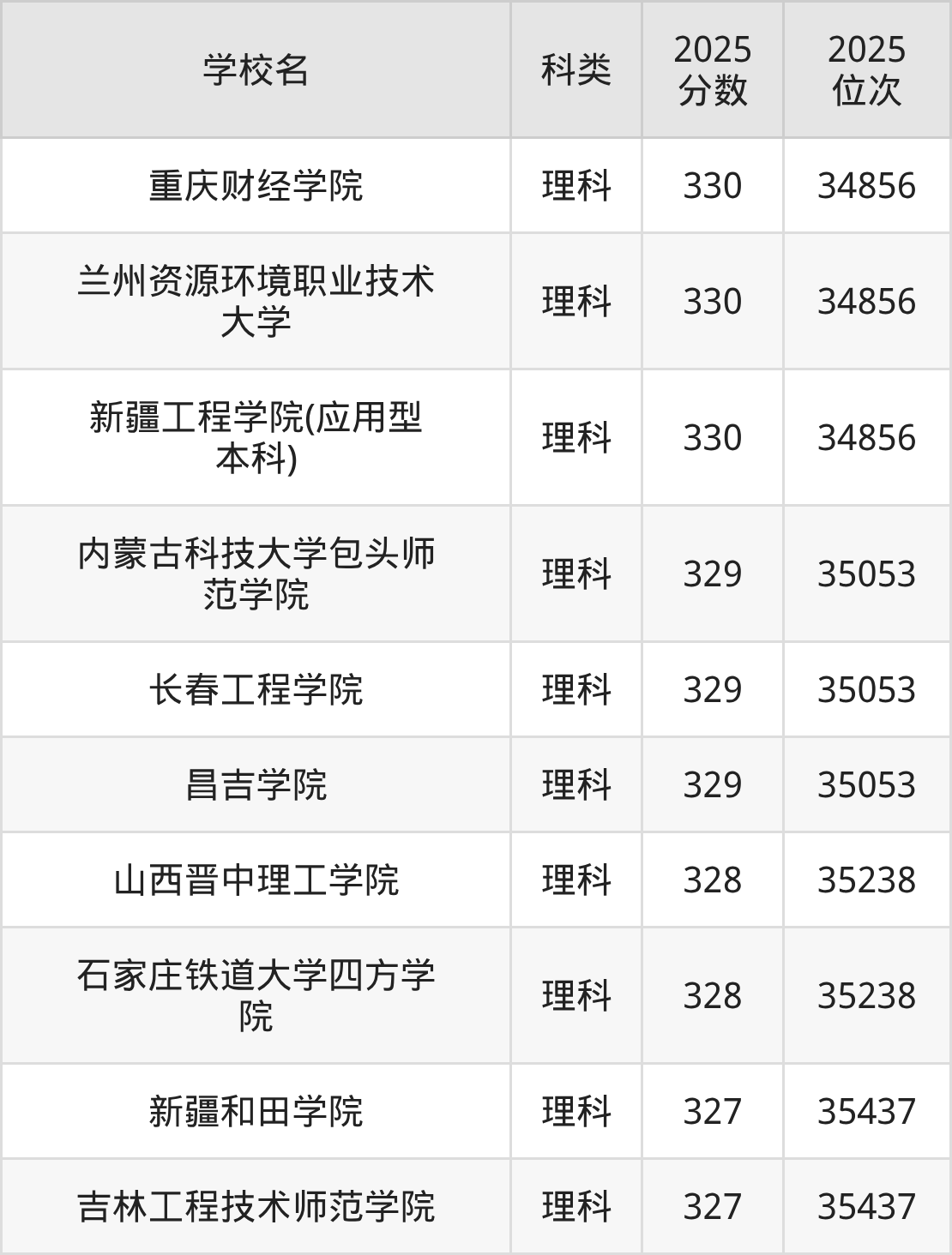 329分可以冲一冲的大学:重庆财经学院330分、兰州资源环境职业技术大学330分、新疆工程学院(应用型本科)330分;