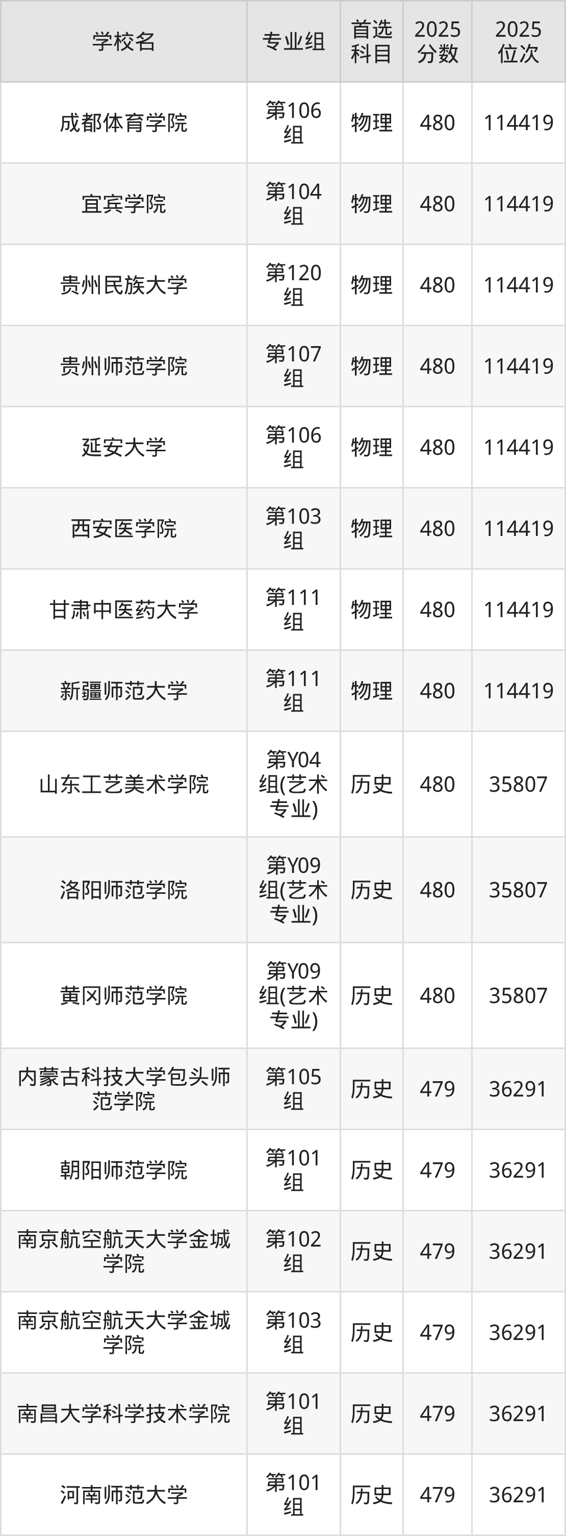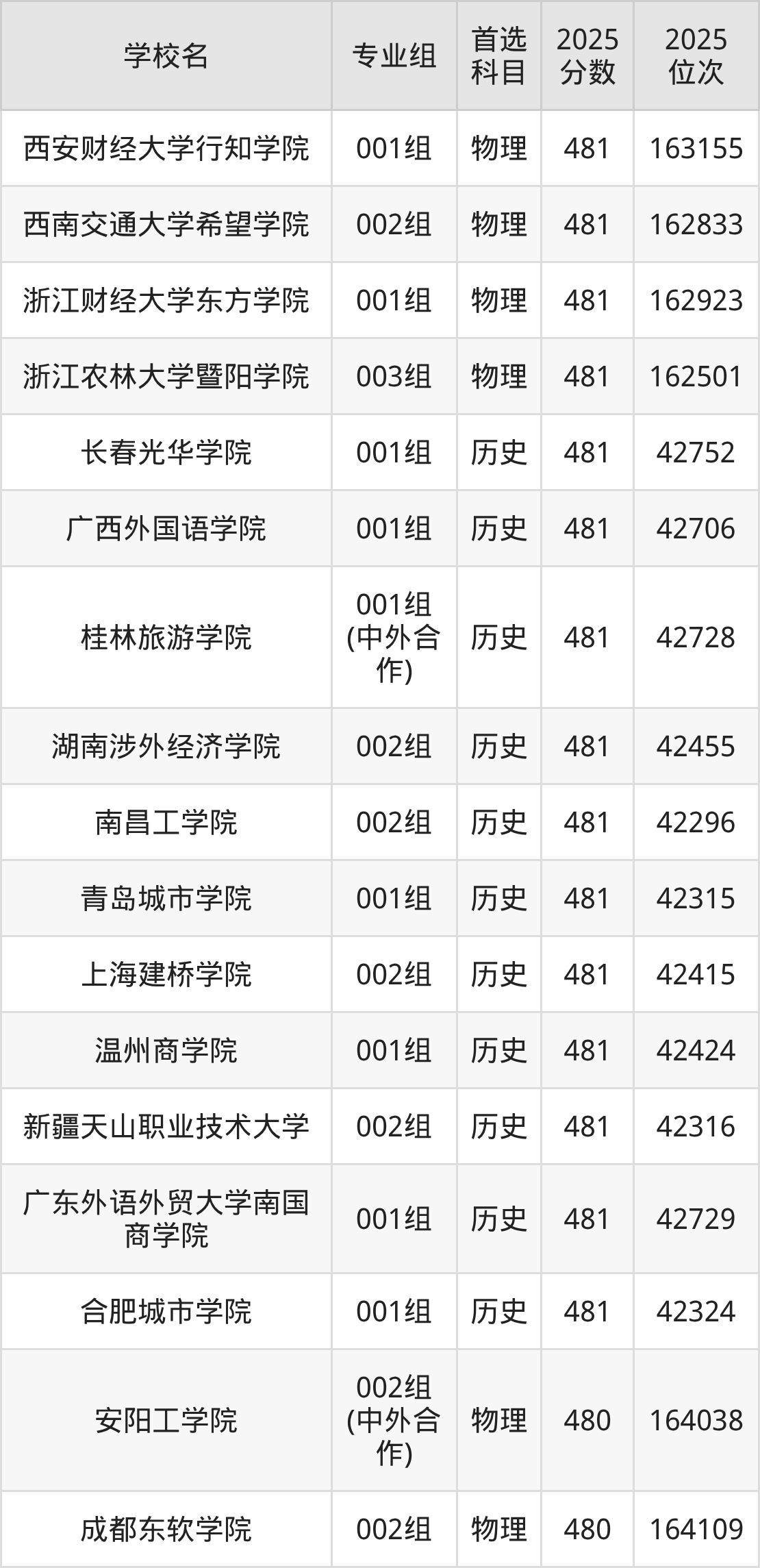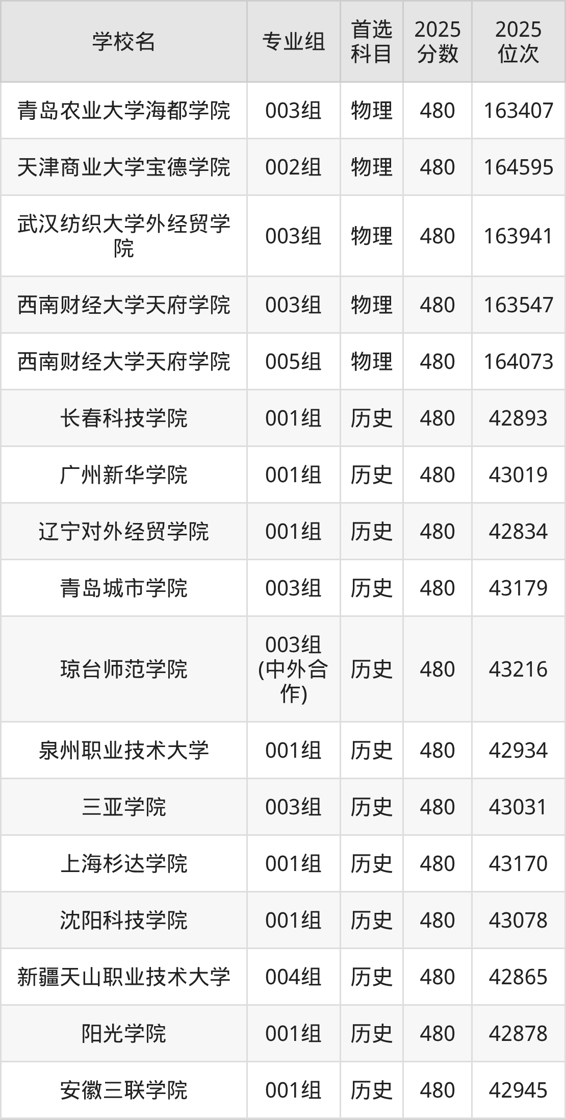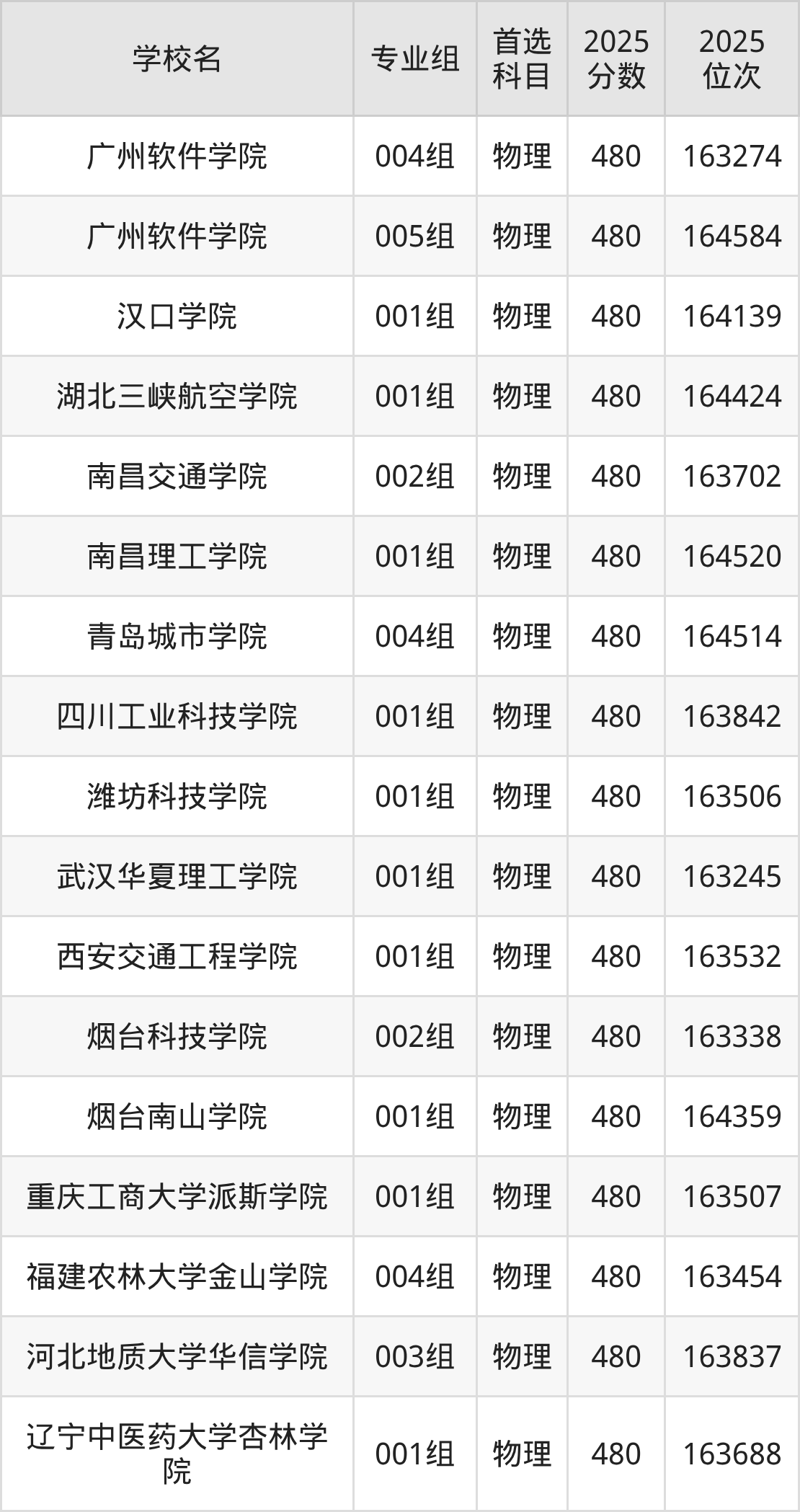 安徽高考物理类480分对应的位次排名是163245名-164595名,历史类480分对应的位次排名是42834名-43216名,因此建议2026年位次排在这附近的同学考虑这些大学。