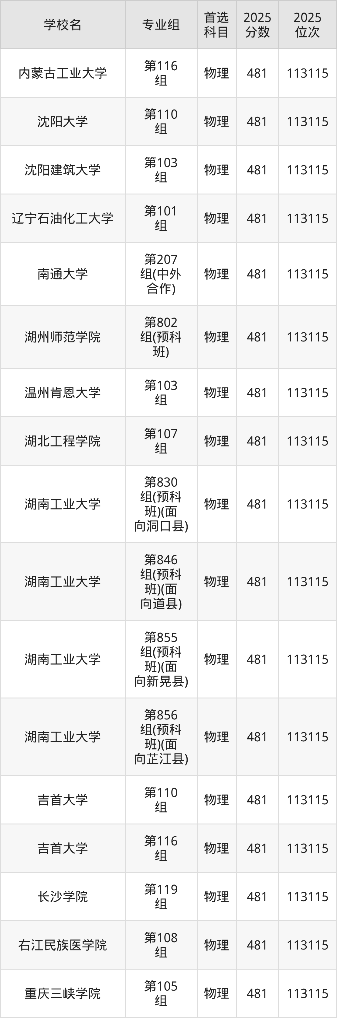 2025年在湖南高考物理类录取分数线是480分的大学有北京建筑大学、天津农学院、天津医科大学临床医学院、河北地质大学、沈阳大学、齐鲁医药学院、郑州师范学院、武汉体育学院、武汉职业技术大学、湖南工业大学等。历史类录取分数线是480分的大学有北京科技大学天津学院、内蒙古民族大学、内蒙古科技大学包头师范学院、吉林工程技术师范学院、黑龙江工业学院、黑龙江八一农垦大学、南京审计大学金审学院、金华职业技术大学、江西师范大学科学技术学院、江西工程学院等。