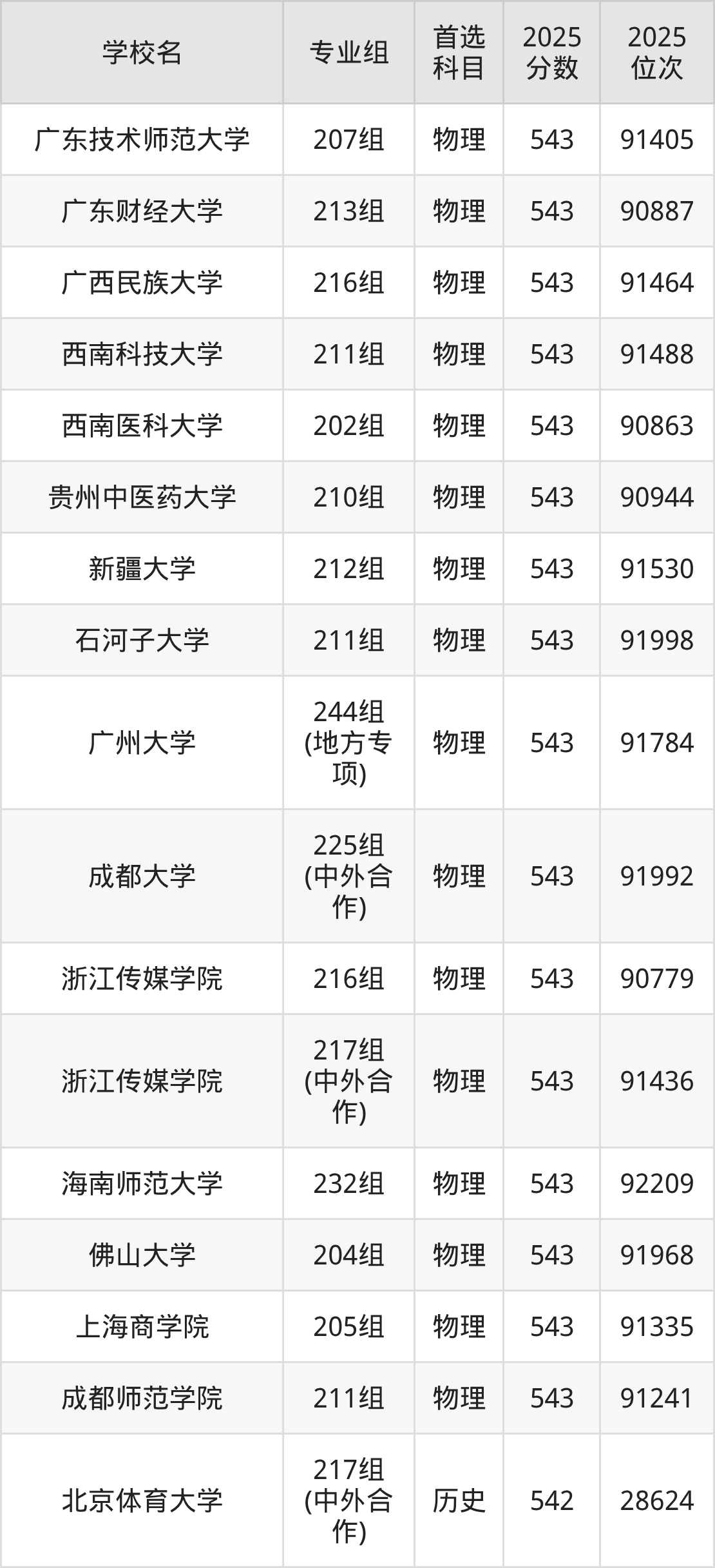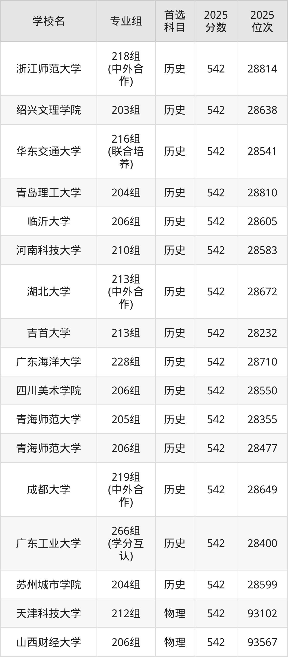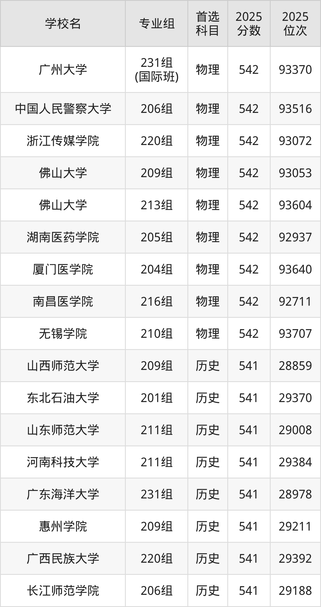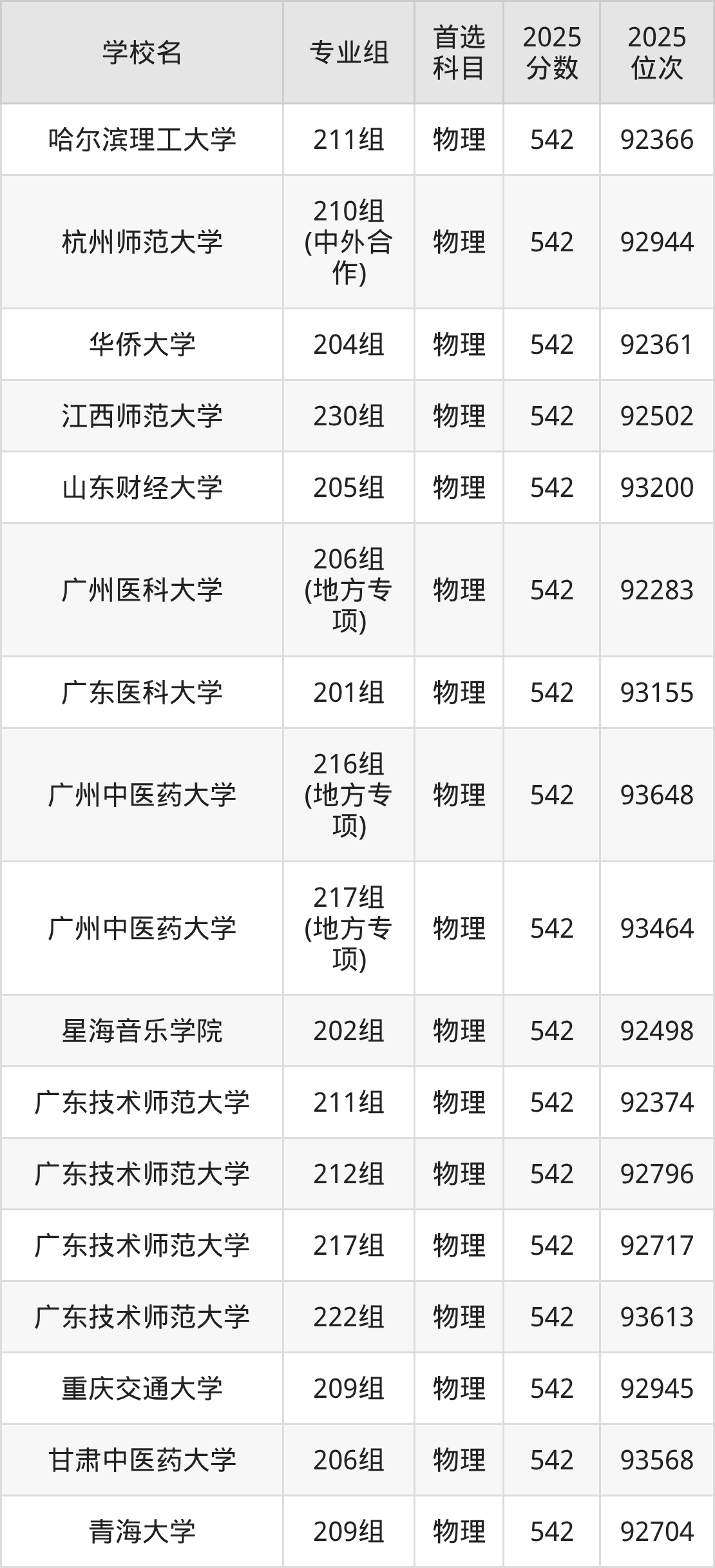 广东高考历史类542分对应的位次排名是28232名-28814名,物理类542分对应的位次排名是92283名-93707名,因此建议2026年位次排在这附近的同学考虑这些大学。
