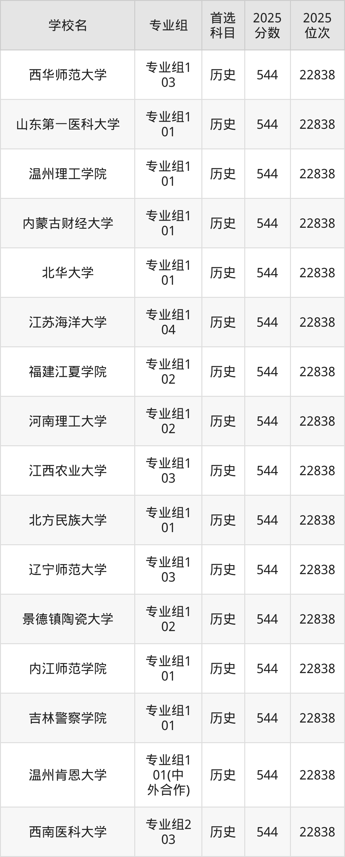 历史类542分可以冲的大学:西华师范大学544分、山东第一医科大学544分、温州理工学院544分、内蒙古财经大学544分等;较稳妥的大学:成都工业学院541分、河北地质大学541分、大理大学541分、贵州民族大学541分等。