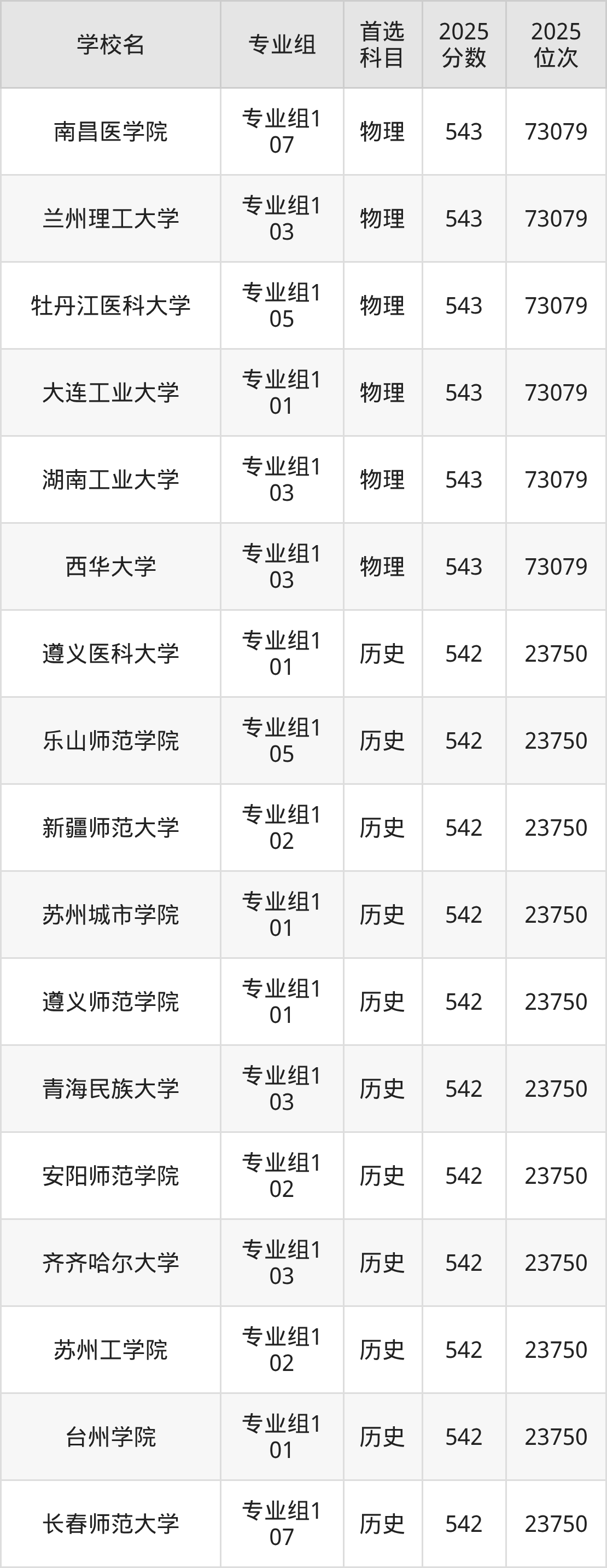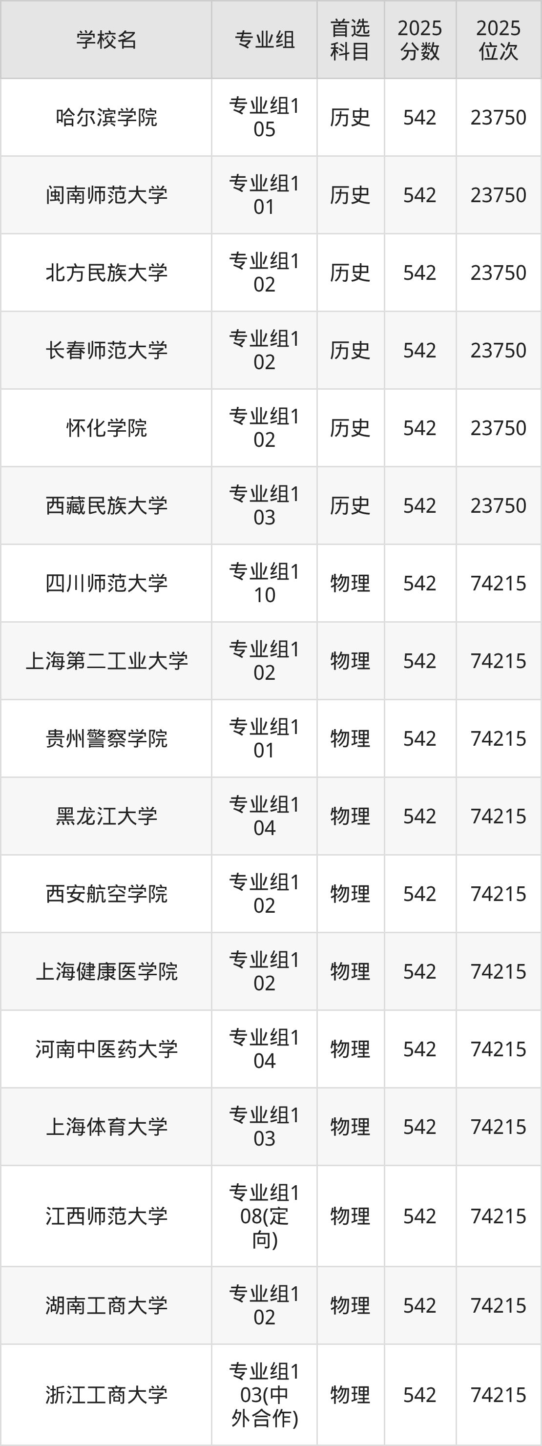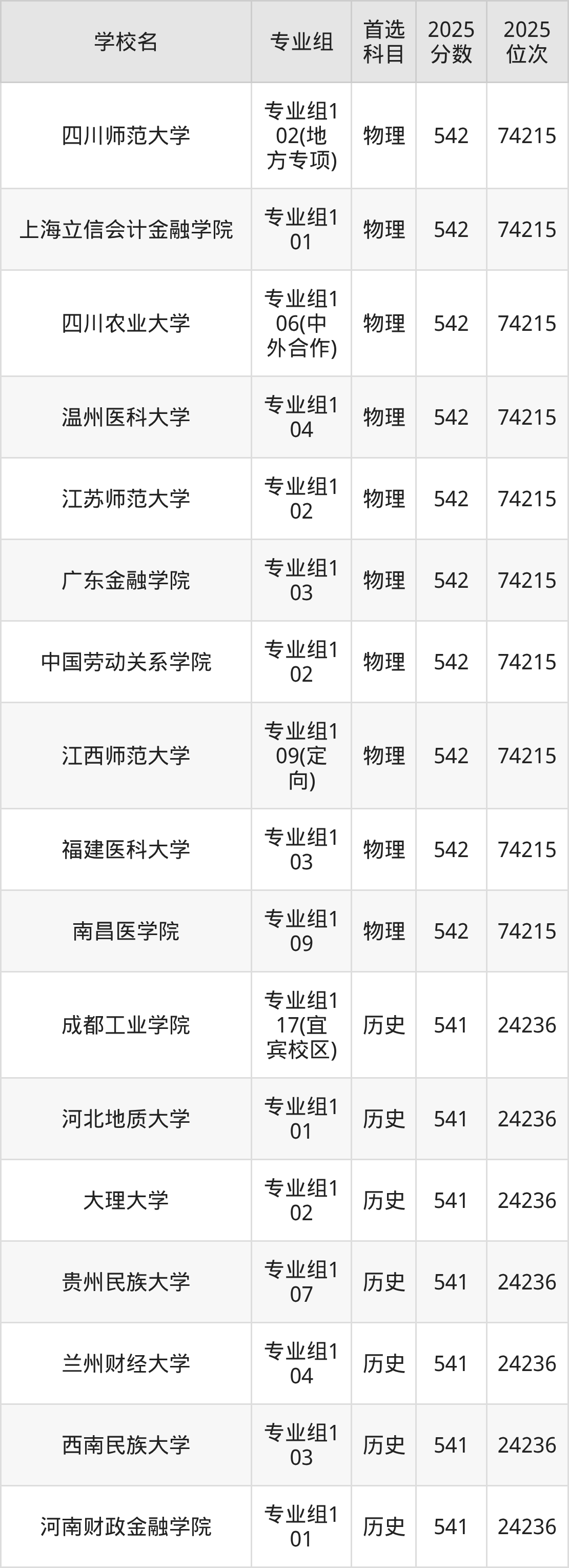 四川高考历史类542分对应的位次排名是23750名,物理类542分对应的位次排名是74215名,因此建议2026年位次排在这附近的同学考虑这些大学。