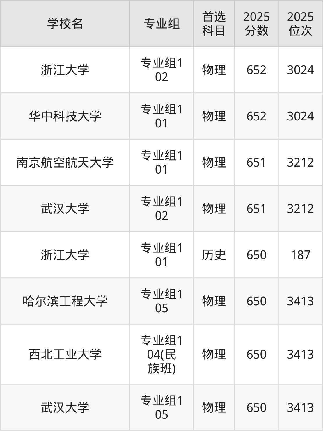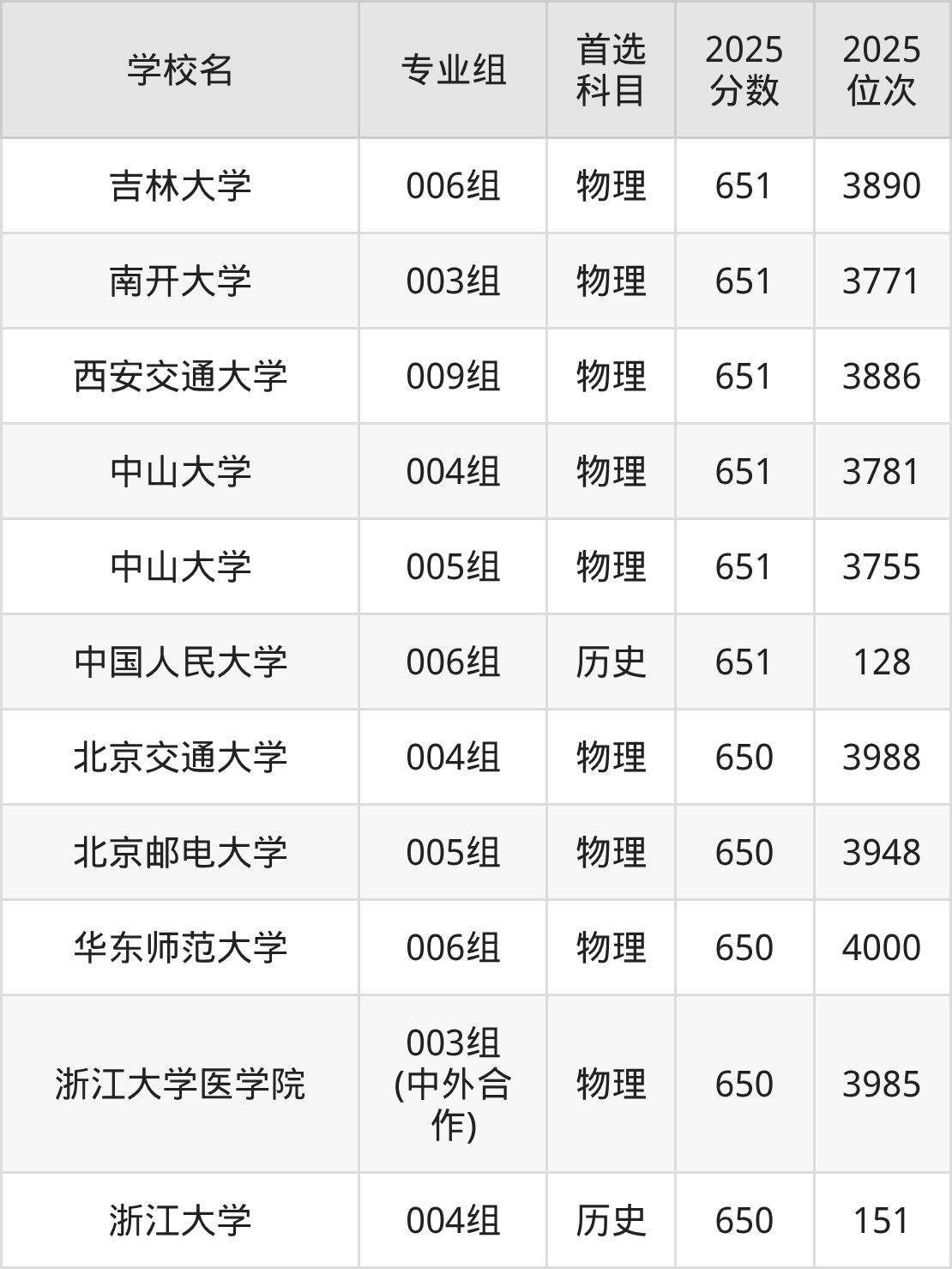 历史类652分较稳妥的大学:中国人民大学651分、浙江大学650分。