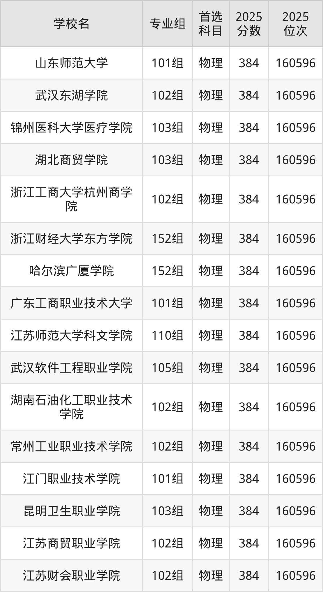 382分可以冲一冲的大学:山东师范大学384分、武汉东湖学院384分、锦州医科大学医疗学院384分、湖北商贸学院384分等;