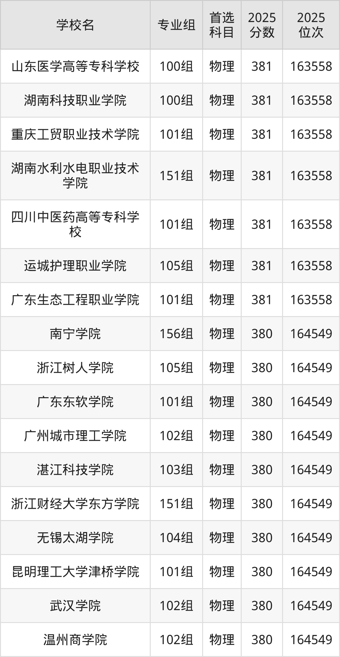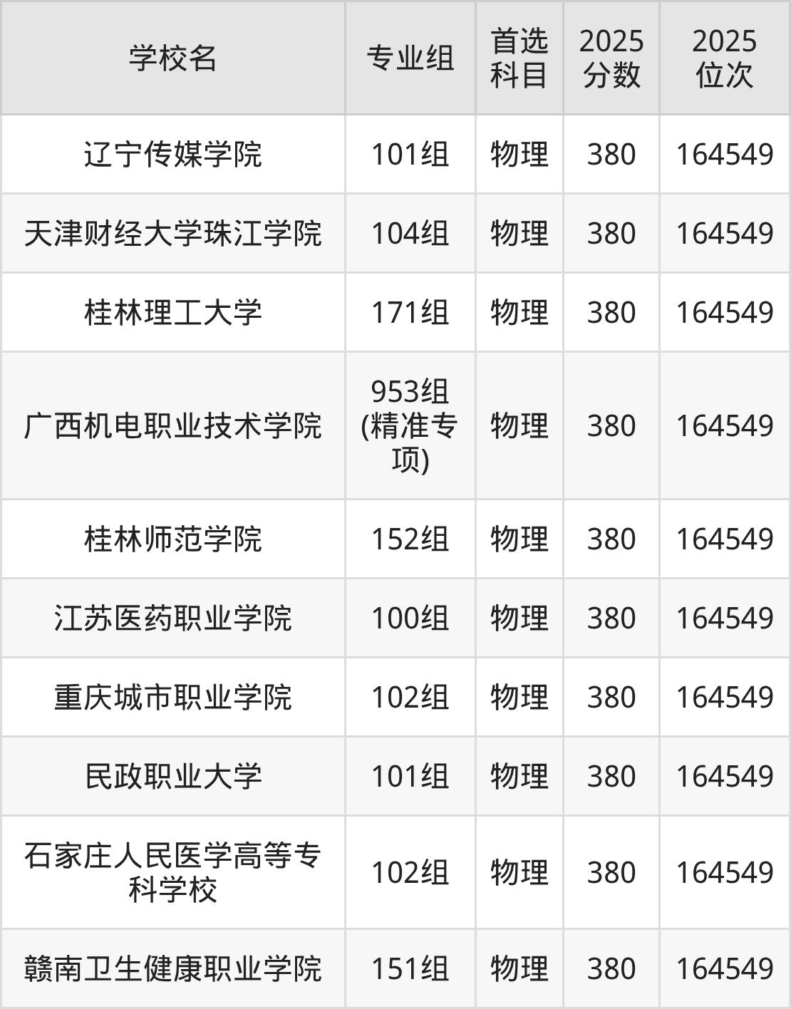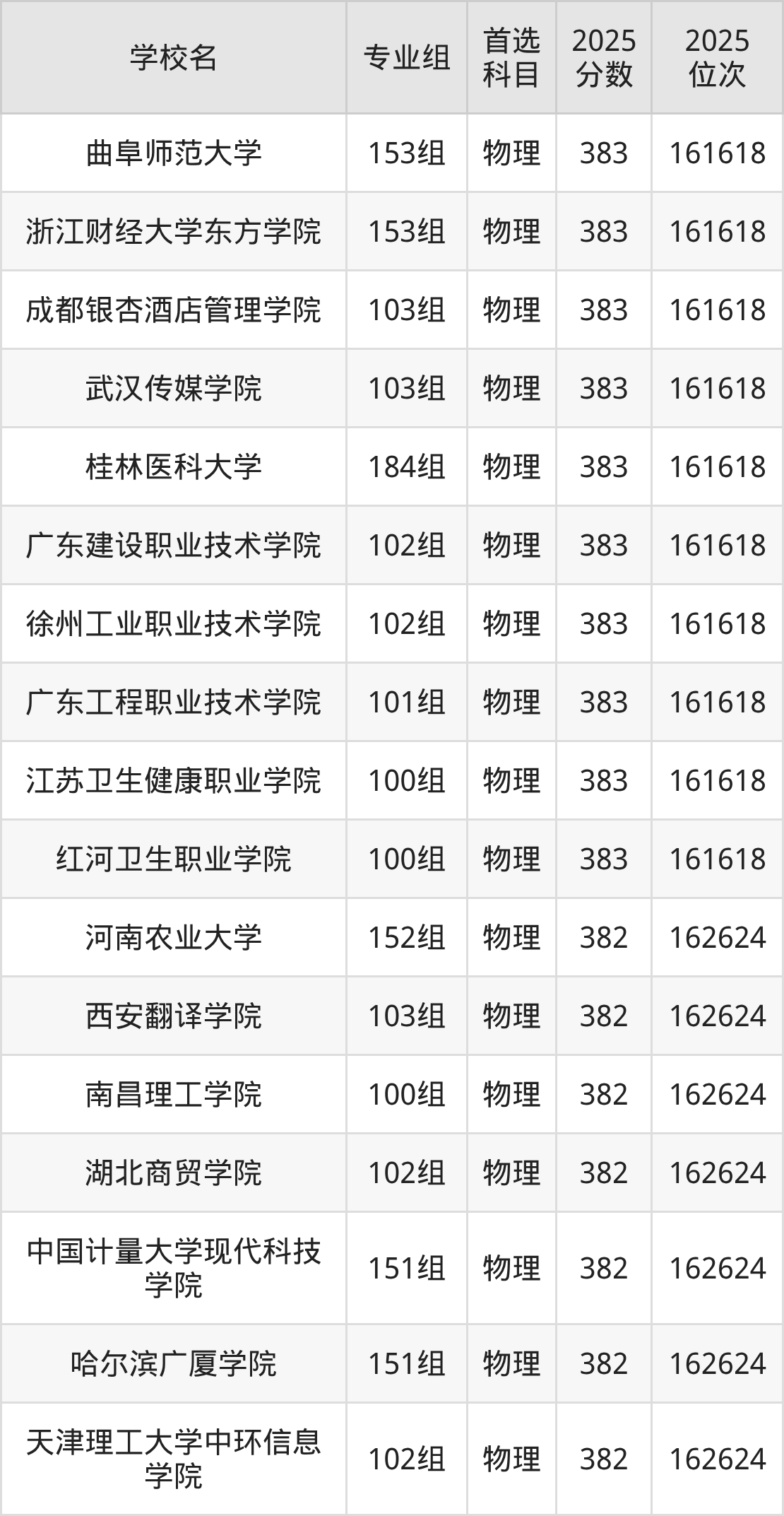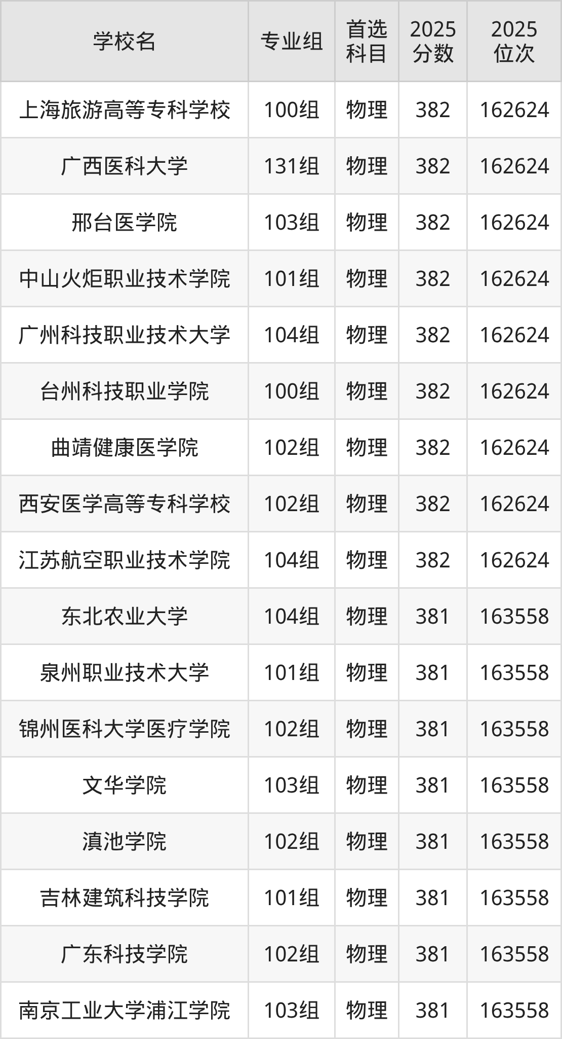 广西物理类382分对应的位次排名是162624名,因此建议2026年位次排在这附近的考生考虑这些大学。