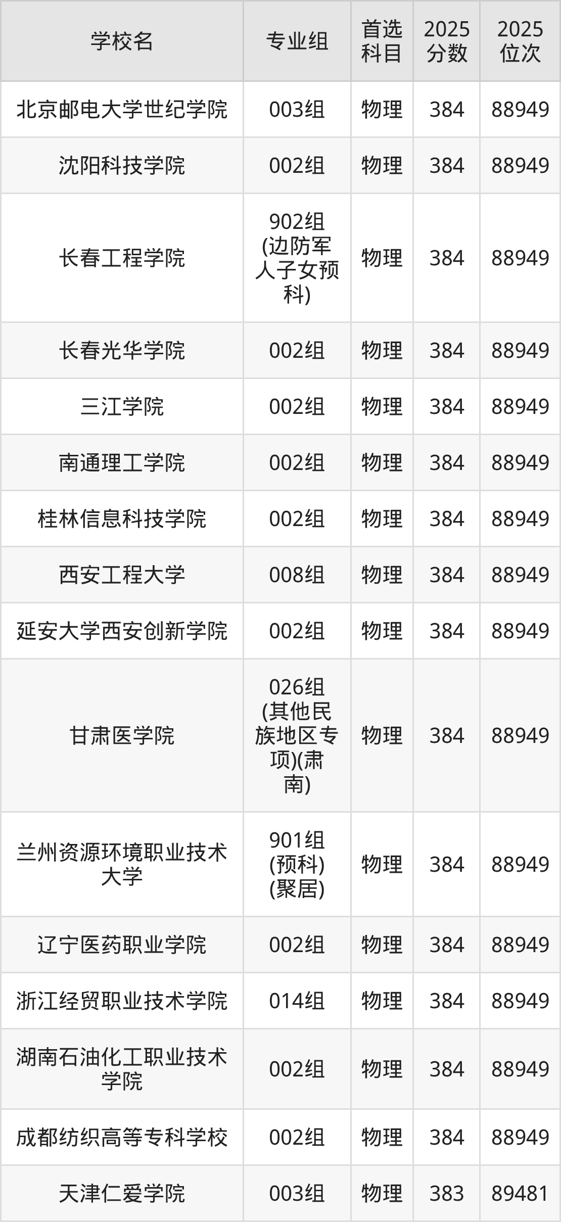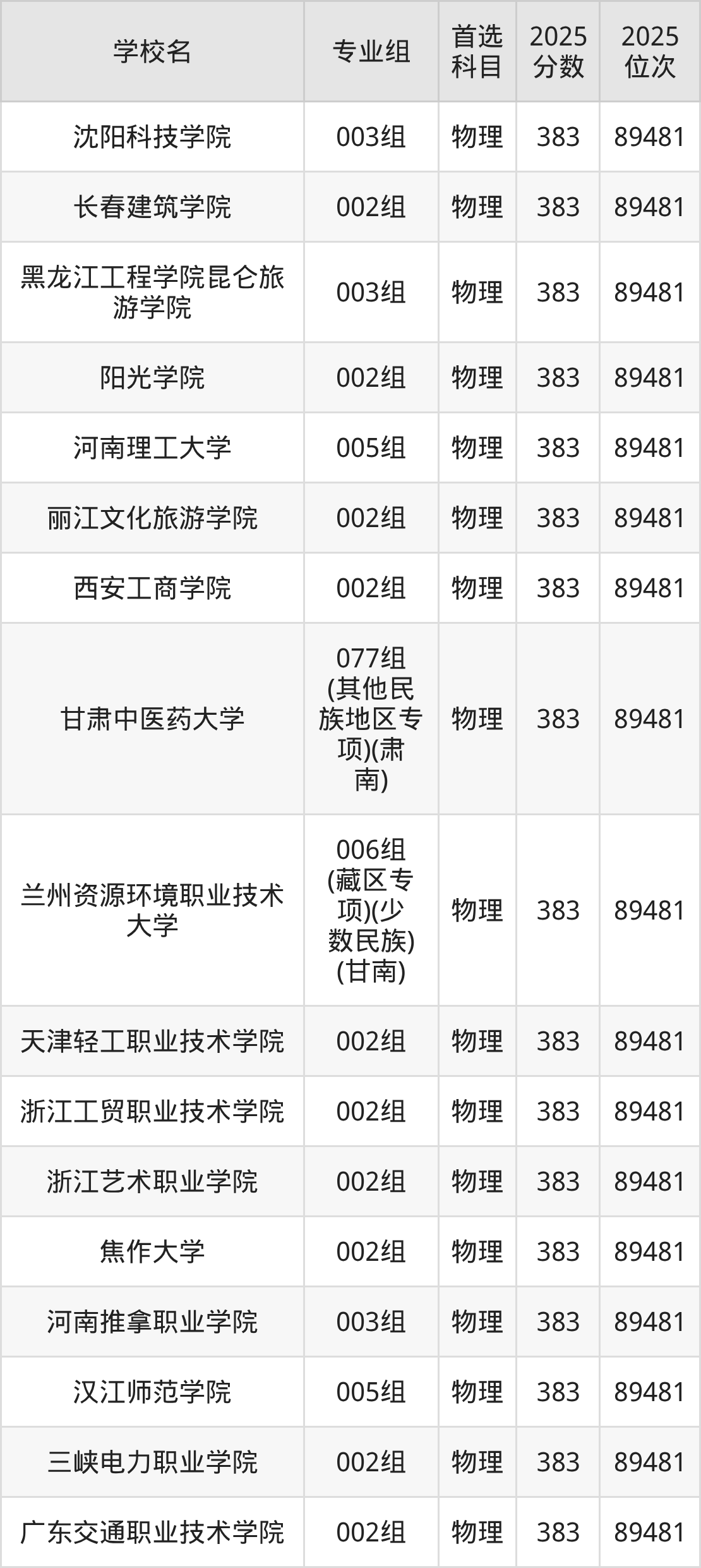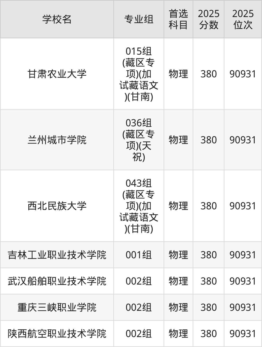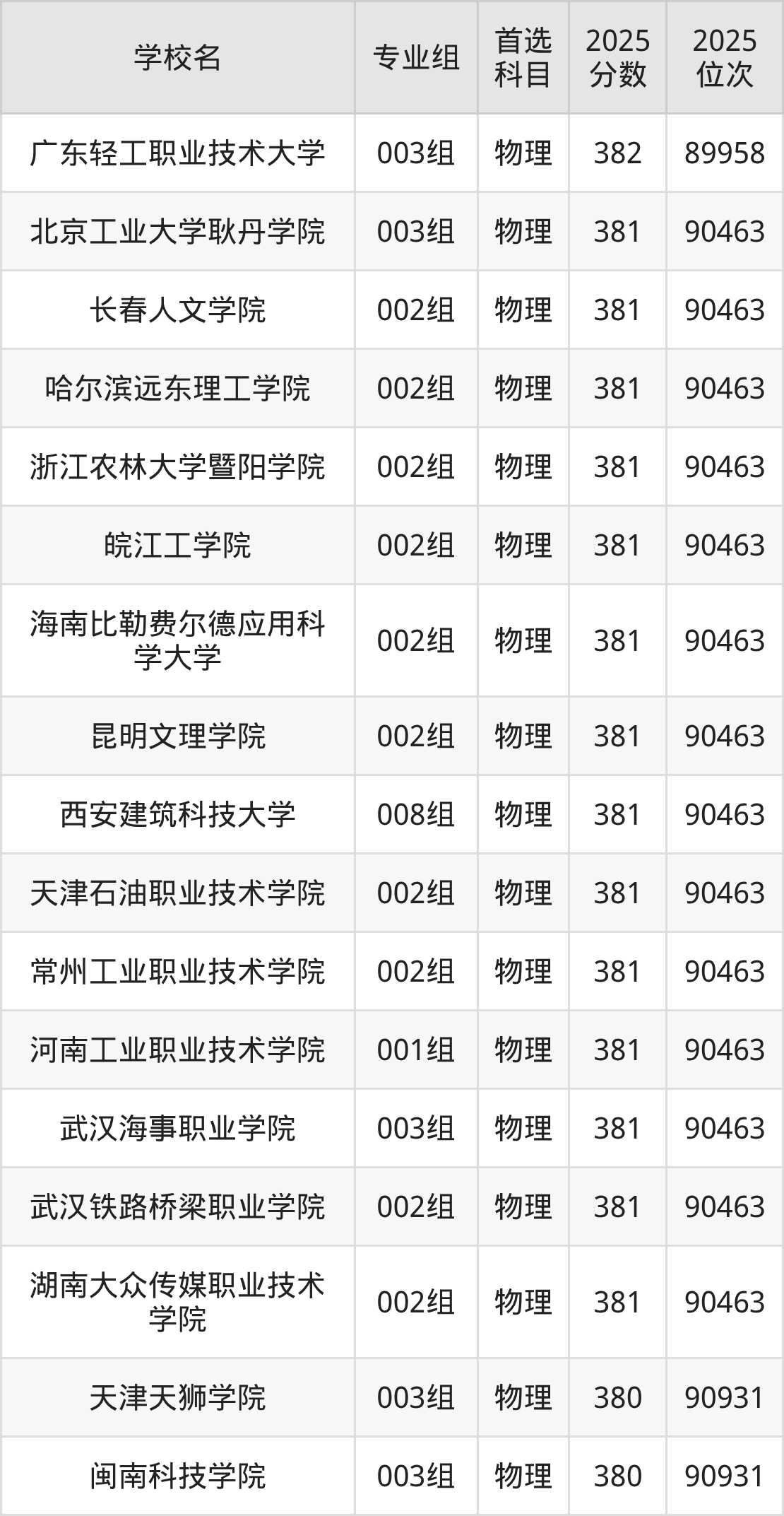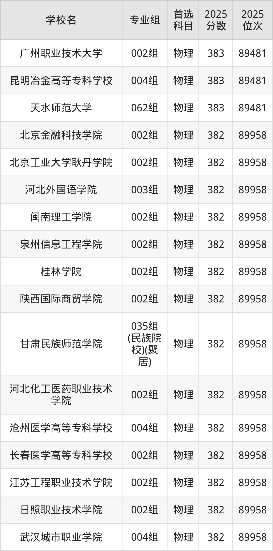甘肃物理类382分对应的位次排名是89958名,因此建议2026年位次排在这附近的考生考虑这些大学。