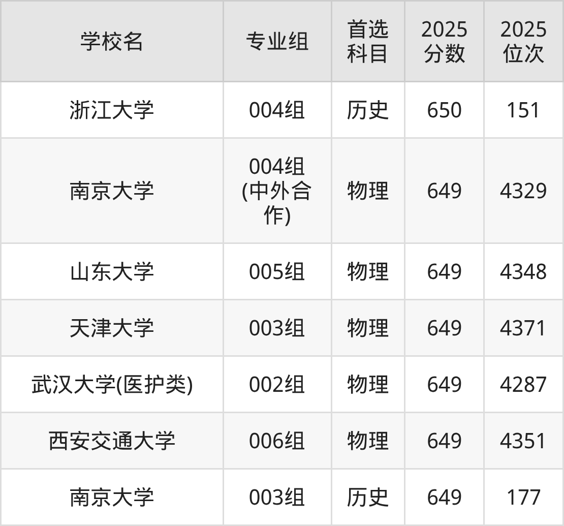 历史类650分可以冲的大学:中国人民大学652分、中国人民大学651分;较稳妥的大学:南京大学649分。
