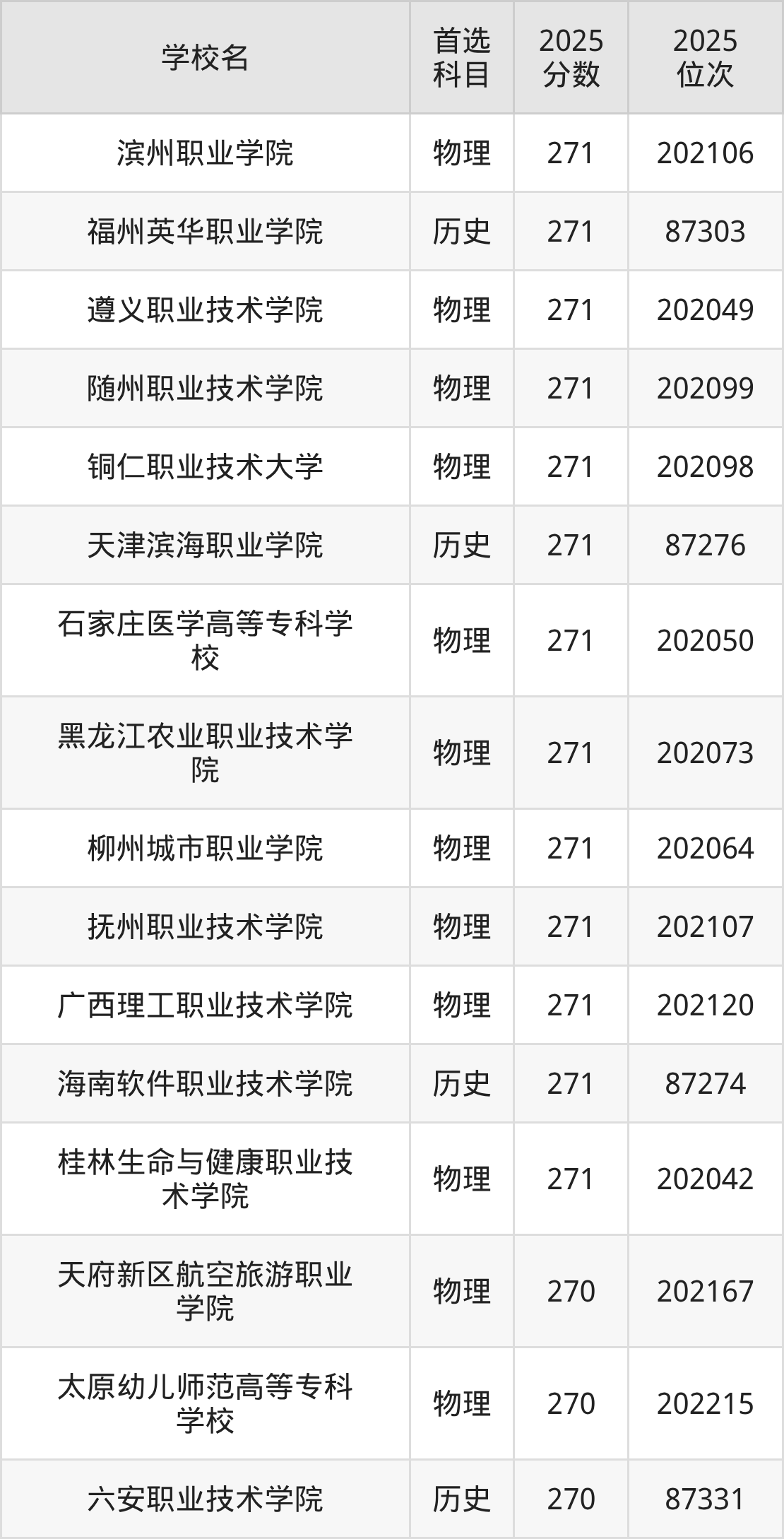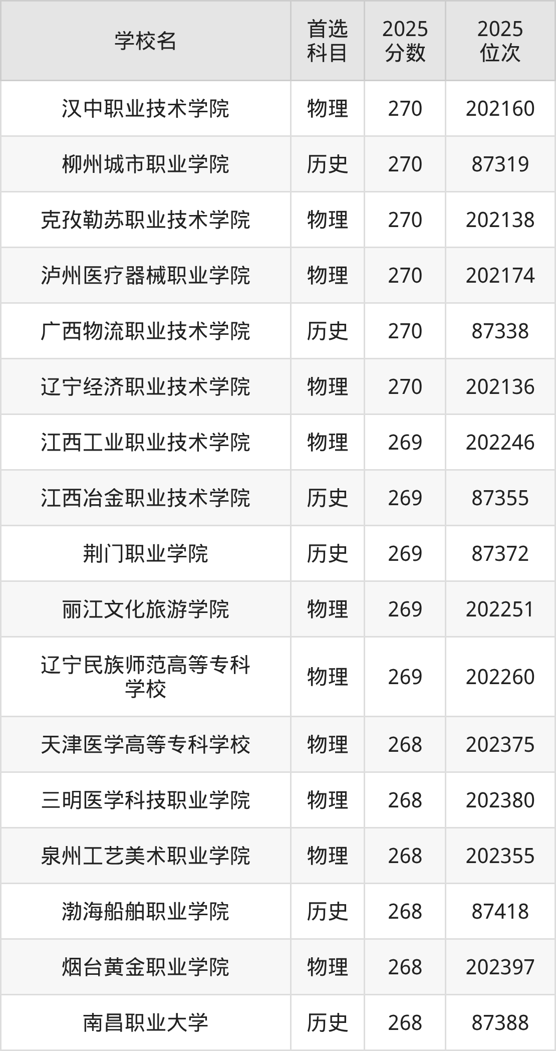 2025年在贵州高考物理类录取分数线是269分的大学有江西工业职业技术学院、丽江文化旅游学院、辽宁民族师范高等专科学校。历史类录取分数线是269分的大学有江西冶金职业技术学院、荆门职业学院。