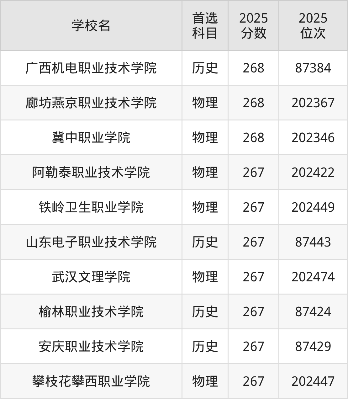 从2025年划定的批次线来看,269分在以下地区可以上专科大学,2025年专科线不超过269分的地区有23个,具体如下: