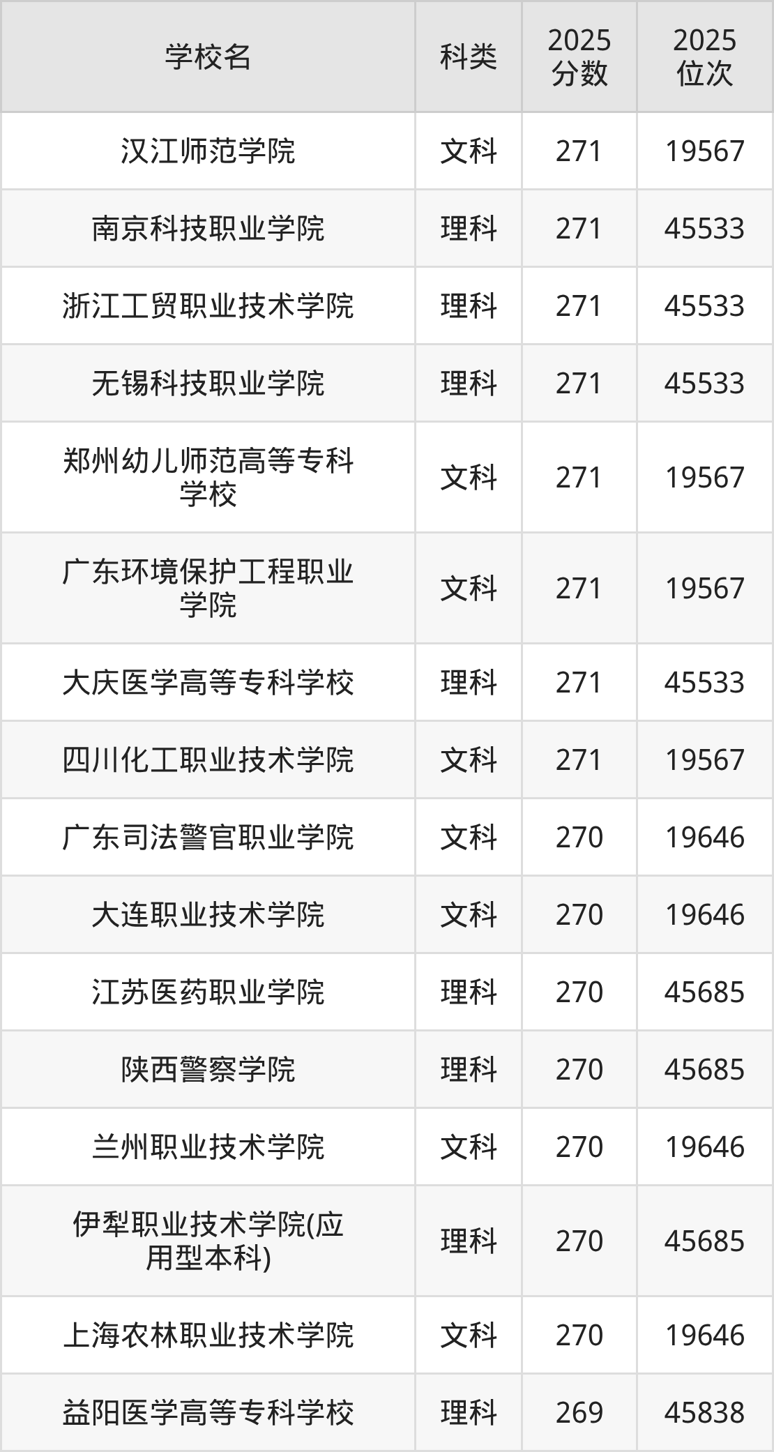 下面老师将以上文整理的其中两个省份为例,为大家具体展示269分左右能上的专科大学名单。