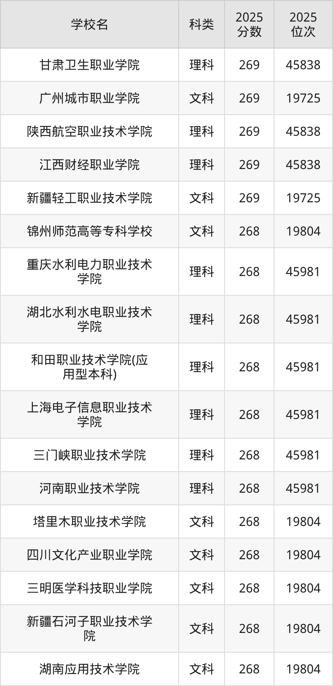 2025年在新疆高考理科录取分数线是269分的大学有益阳医学高等专科学校、甘肃卫生职业学院、陕西航空职业技术学院、江西财经职业学院。文科录取分数线是269分的大学有广州城市职业学院、新疆轻工职业技术学院。