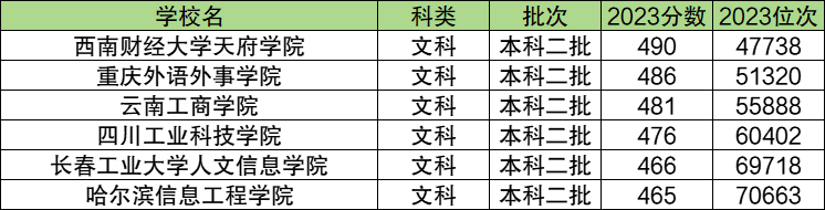 文科考生比较推荐哈尔滨信息工程学院(465分)、长春工业大学人文信息学院(466分)、四川工业科技学院(476分)、云南工商学院(481分)、重庆外语外事学院(486分),都是在文科中分数比较低的公办计算机大学,最低超过二本线7分就能上。