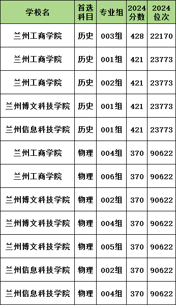 2024年甘肃民办本科最低录取分数线物理类是370分,分数线最低的学校(专业组)是兰州工商学院006组、兰州博文科技学院002组、兰州信息科技学院002组。历史类最低分是421分,分数线最低的学校(专业组)是兰州工商学院002组、兰州博文科技学院001组、兰州信息科技学院001组。