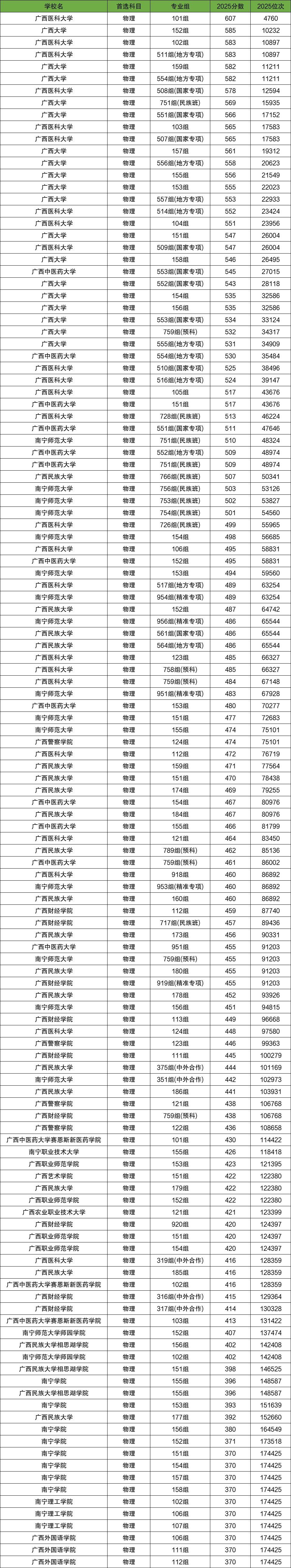 2025年南宁本科各大学专业组录取分数线(物理类):