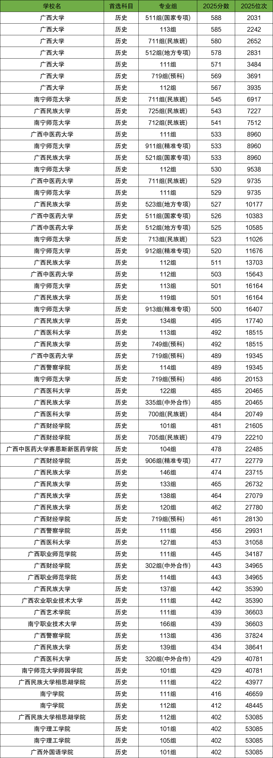 2025年南宁本科各大学专业组录取分数线(历史类):