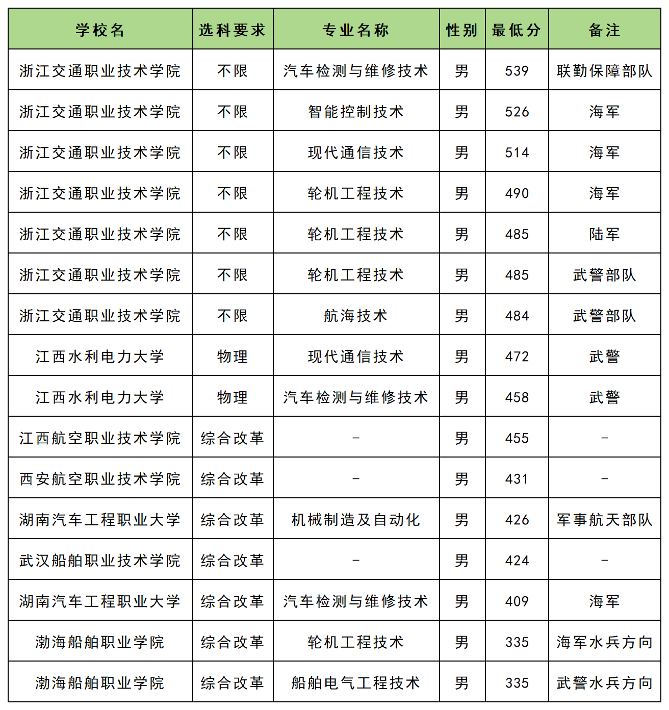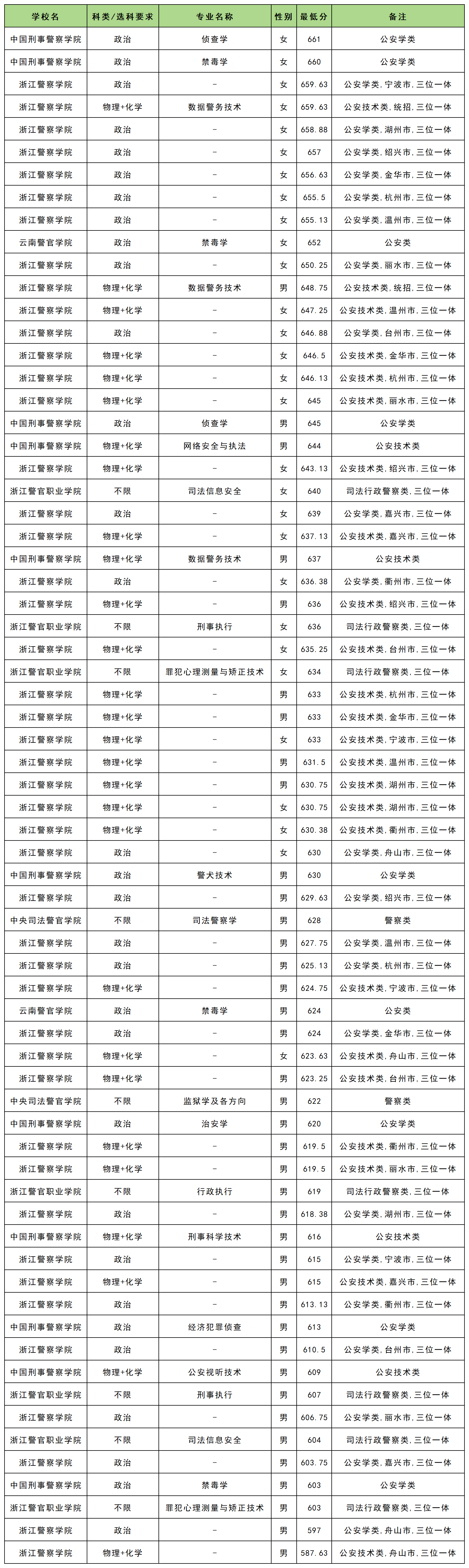 因为在提前批招生院校较多,受到篇幅限制,本文就以警校和定向士官为例,整理出这两类院校在浙江提前批的录取分数线。
