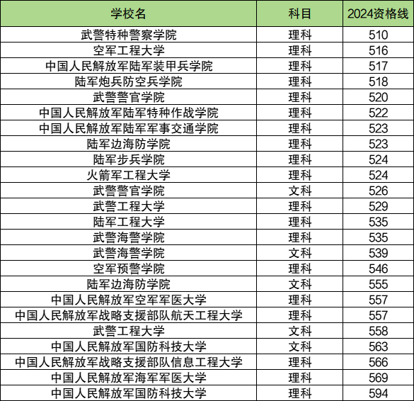 武警警官学院(526分)、武警海警学院(539分)、陆军边海防学院(555分)、武警工程大学(558分)等。