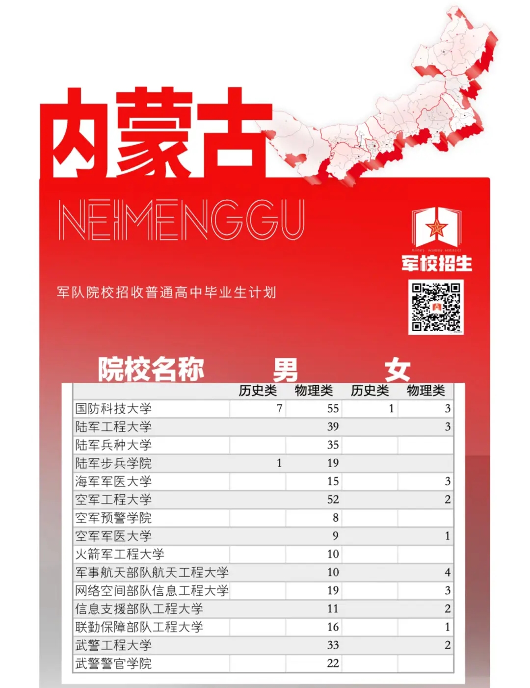 下面为2025年内蒙古自治区军校招生计划表,供查阅: