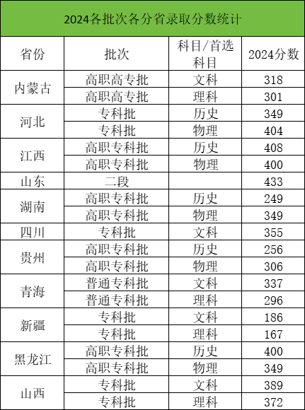 2024年呼和浩特职业学院专科批招生,各省最低录取分数线如下:
