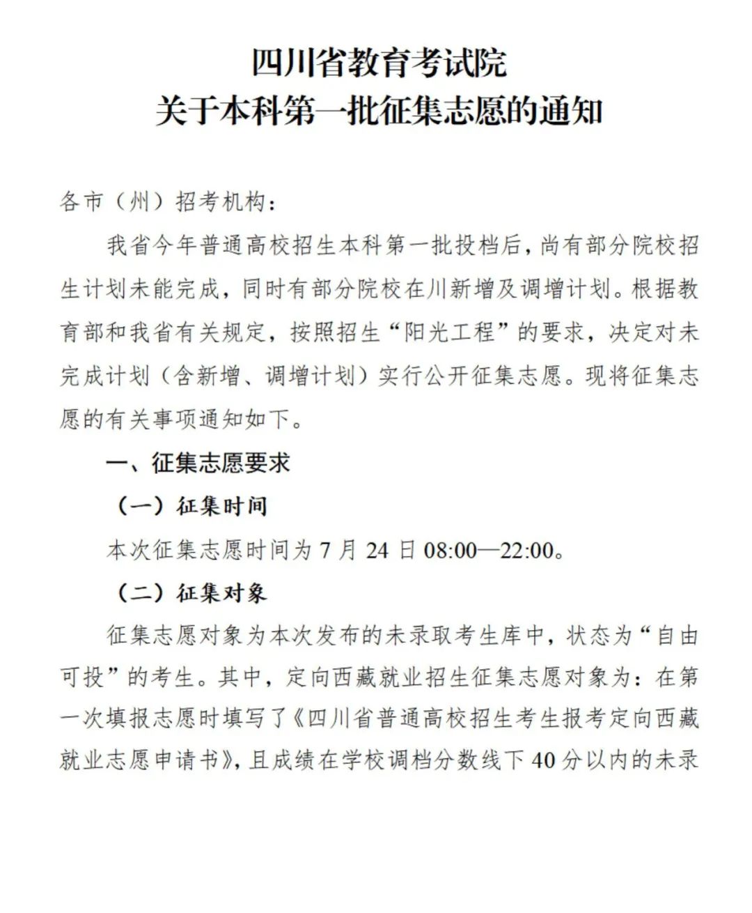 本科批剩余计划第一次征集志愿(填报时间:7月24日14:00-20:00)