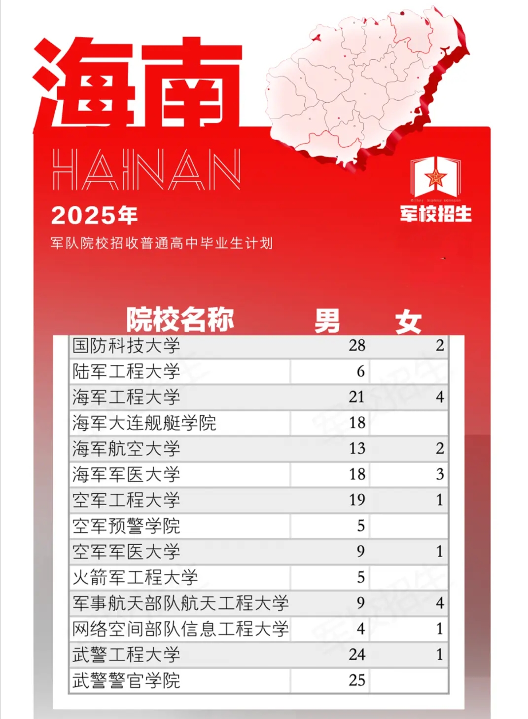 因为在提前批招生院校较多,受到篇幅限制,本文就以军校、警校和定向士官为例,整理出这三类院校在海南提前批的录取分数线。