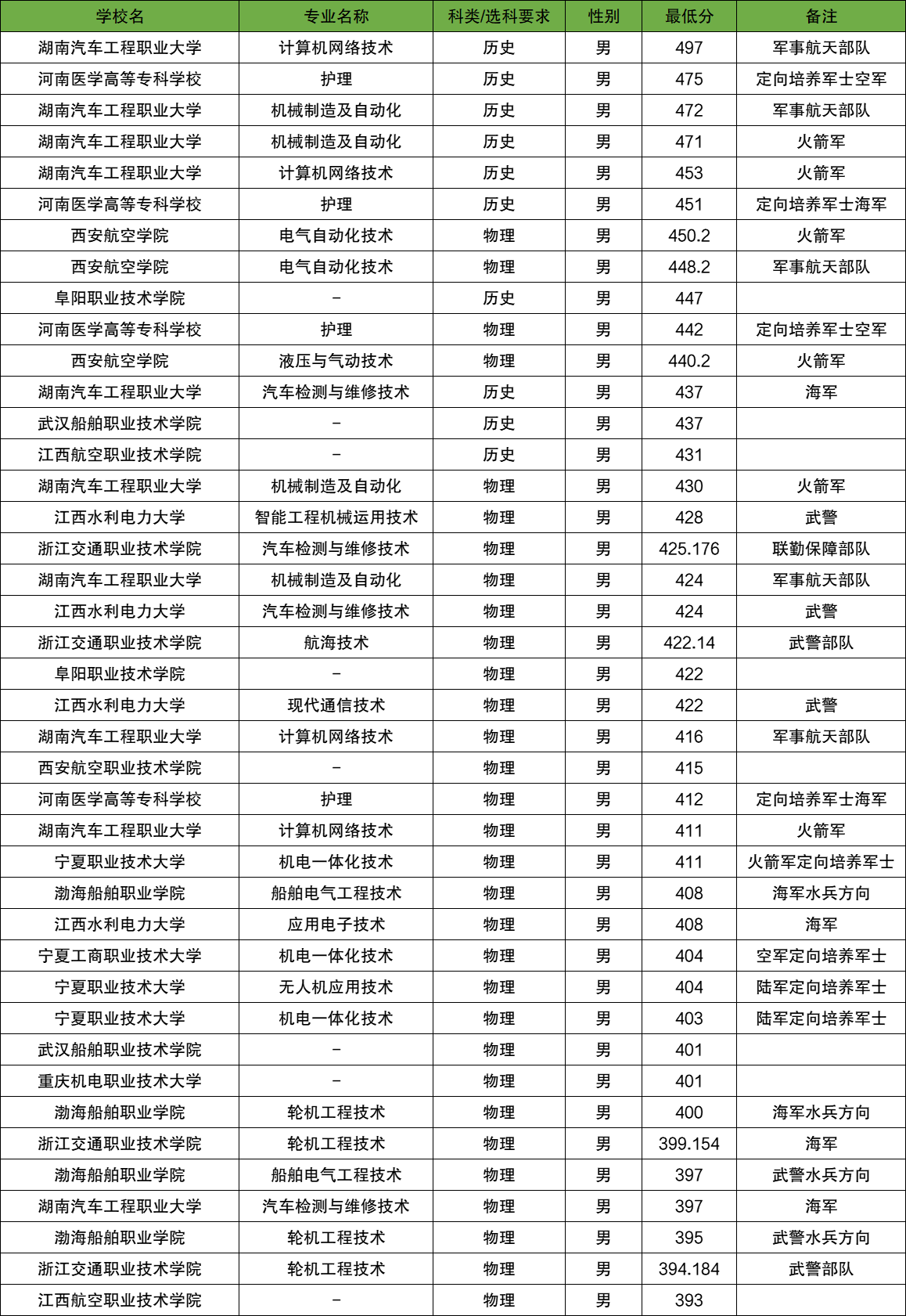 根据2025年河南招录数据,考生分数至少要在专科线上208分,即393分以上才有可能会被录取,且低分院校有江西航空职业技术学院、浙江交通职业技术学院等。