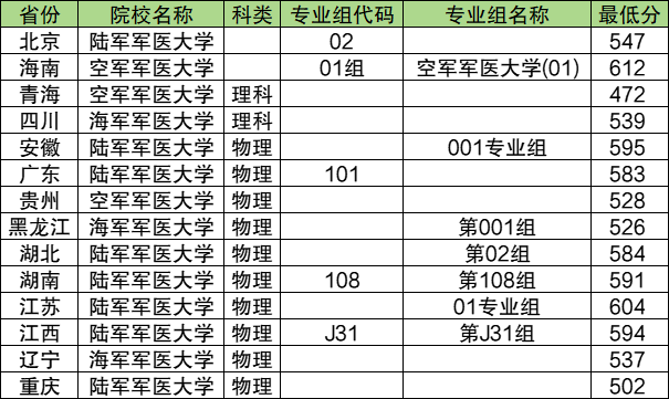 2024年军医大学在新高考3+3地区的最低录取分数线位于547分到612分之间,各地军医大学最低分数线及对应位次排名如下。