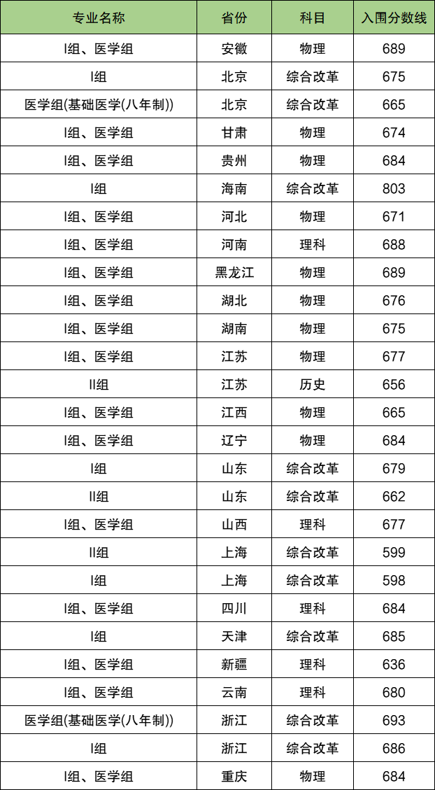 2024年北京大学强基计划入围分数最高分为803分,是海南省考生,入围专业为I组。最低分为598分,是上海市考生,入围专业为I组。I组专业包含数学类、物理学类、化学类、力学类、生物科学类、历史学类、考古学、哲学类、中国语言文学类(古文字学方向)。II组专业包含历史类、考古学、哲学类、中国语言文学类(古文字学方向)。医学组专业包含基础医学(八年制)。