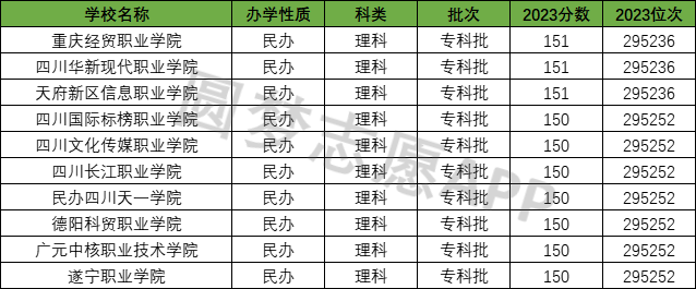 下表是2023年全国大专院校在四川理科的录取分数最低的10所民办大专院校名单,其中,有7所院校的录取最低分为150分,也就是说只要达到理科专科分数线就能上大专院校。