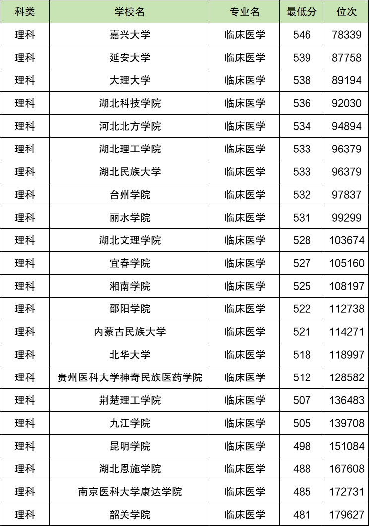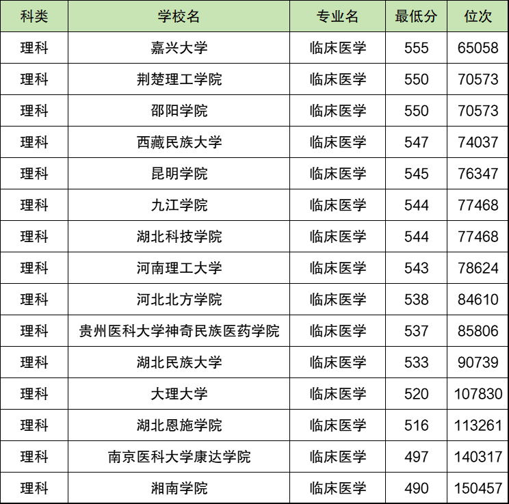 最低分的二本临床医学专业大学是湘南学院,录取分数线490分,位次150457名。