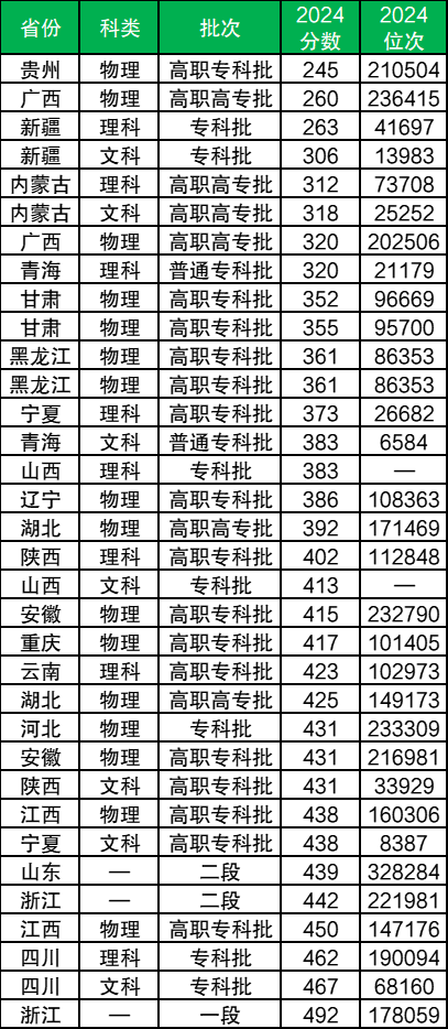 2024年该校的在全国的最低录取分数线在245分以上,最高收分省份在浙江,分数达492分,对应位次是178059名。