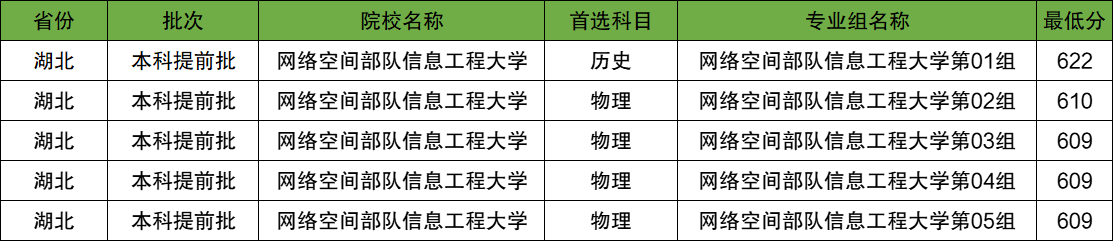 2025年网络空间部队信息工程大学生长军官本科学员在湖北的录取分数线整理如下,供大家参考。
