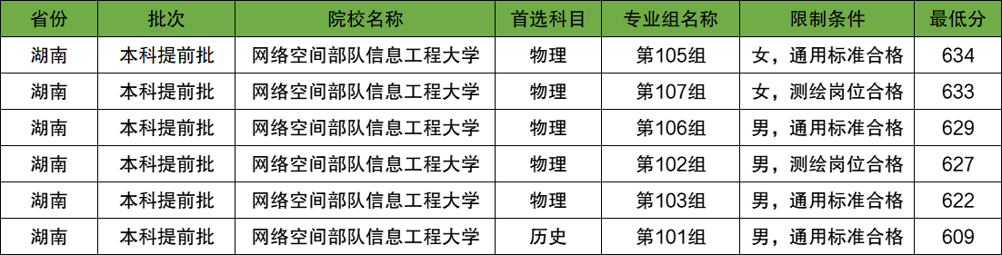 2025年网络空间部队信息工程大学生长军官本科学员在湖南的录取分数线整理如下,供大家参考。