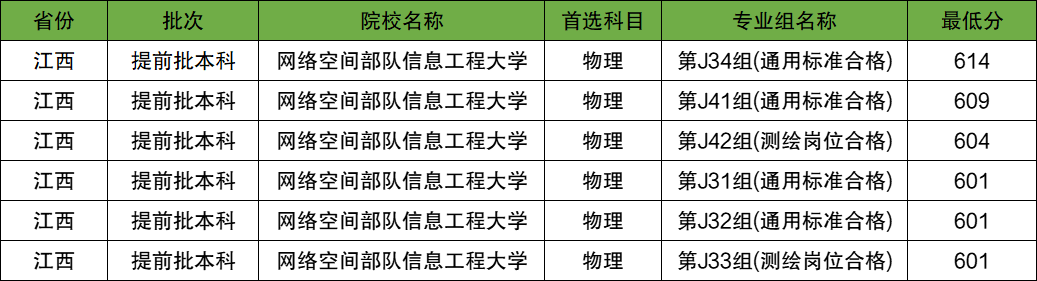 2025年网络空间部队信息工程大学生长军官本科学员在江西的录取分数线整理如下,供大家参考。