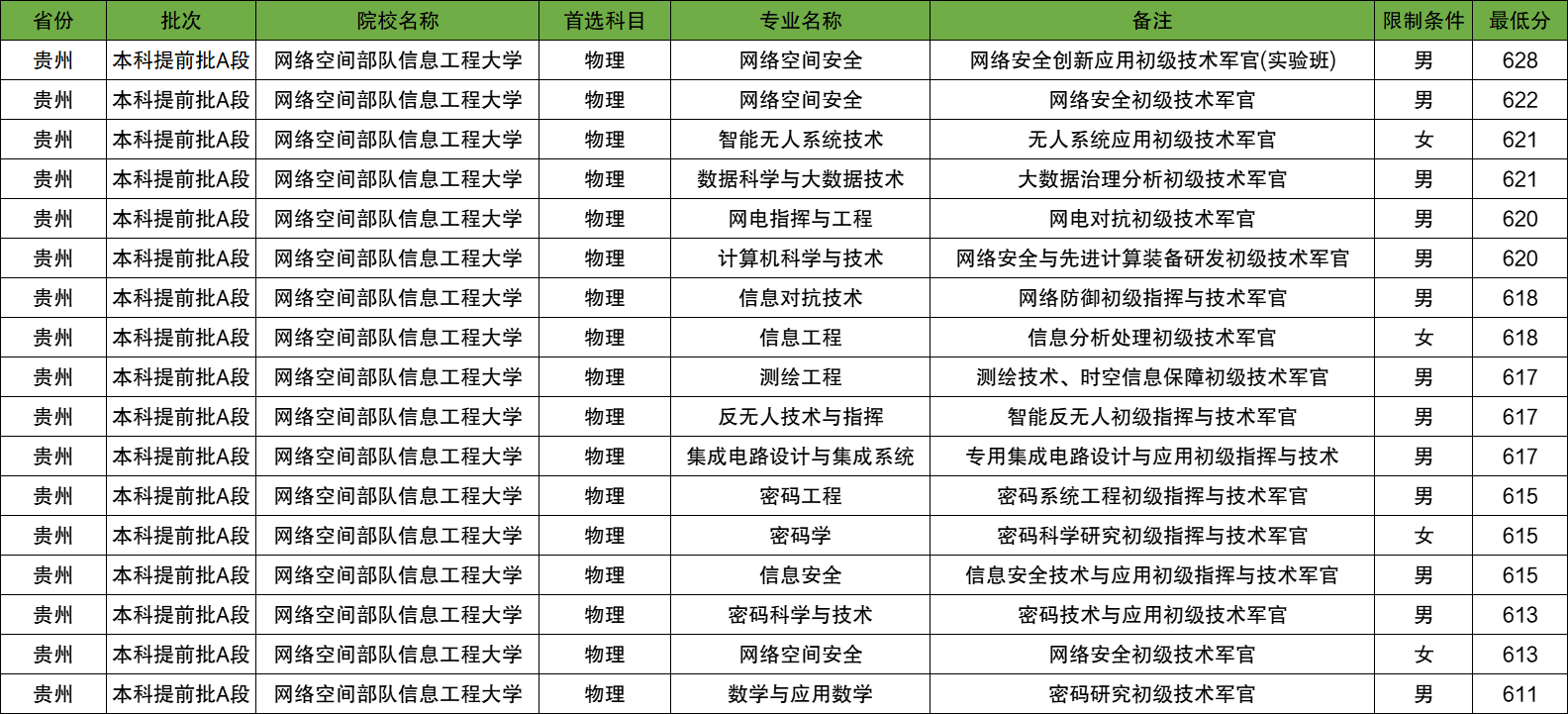 2025年网络空间部队信息工程大学生长军官本科学员在贵州的录取分数线整理如下,供大家参考。
