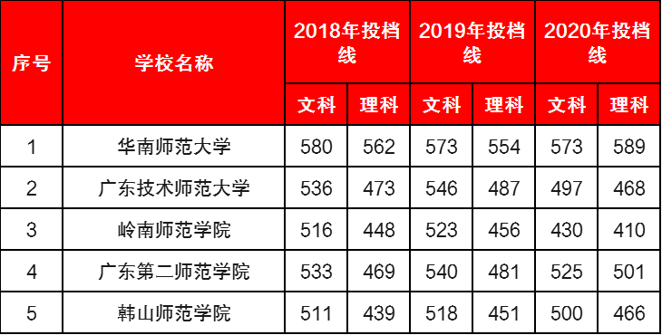 广东一共有五所公办师范类大学,分别是华南师范大学、广东第二师范学院、韩山师范学院、岭南师范学院、广东技术师范大学,而其录取情况如图: