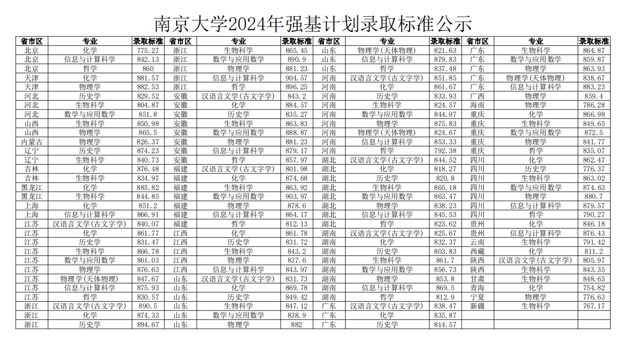 由于南京大学2024年强基计划入围分数未公布完整,所以本文将给大家带来已公布强基计划入围分数的省份,如下: