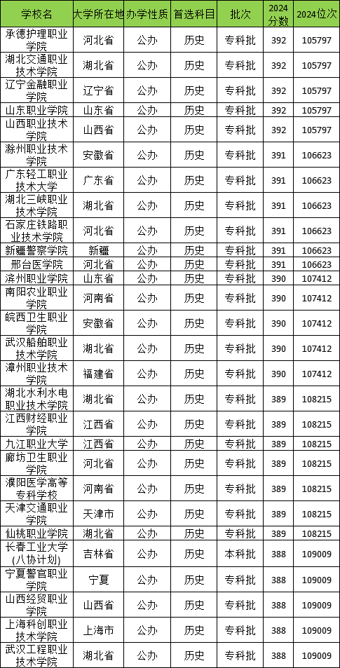 可以看到,2024年河北省高考390分左右的历史类考生可以报考承德护理职业学院392分、湖北交通职业技术学院392分、辽宁金融职业学院392分等。