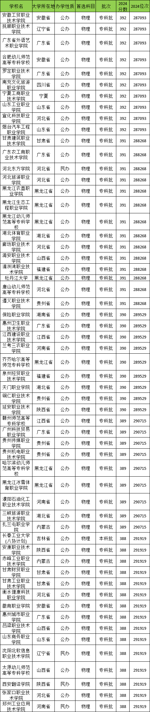 可以看到,2024年河北省高考390分左右的物理类考生可以报考安徽工贸职业技术学院392分、抚顺职业技术学院392分、广东省外语艺术职业学院392分等。