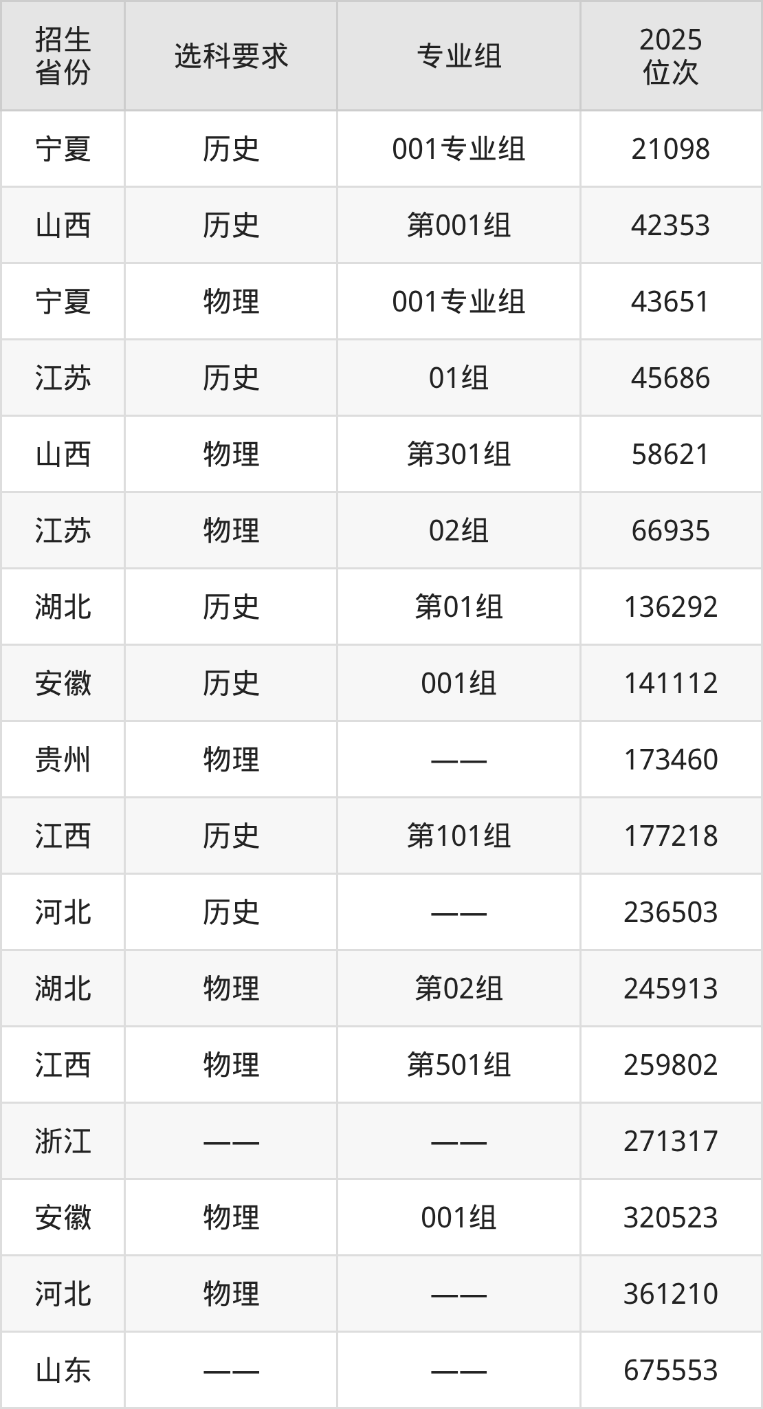 金山职业技术学院2025年在全国各省的位次差异较大,最高位次是21098位(宁夏历史类)、最低位次是675553位(山东)。各省具体位次请看下图: